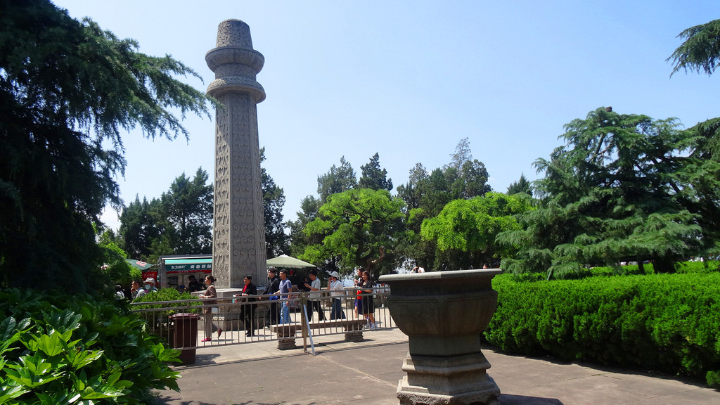 墓碑高9米,重达几十吨,是用一块巨大的花岗石雕琢而成,自右至左竖刻三行鎏金碑文: