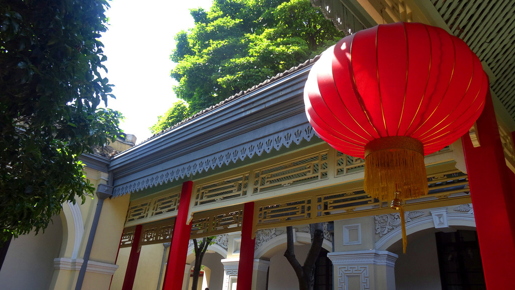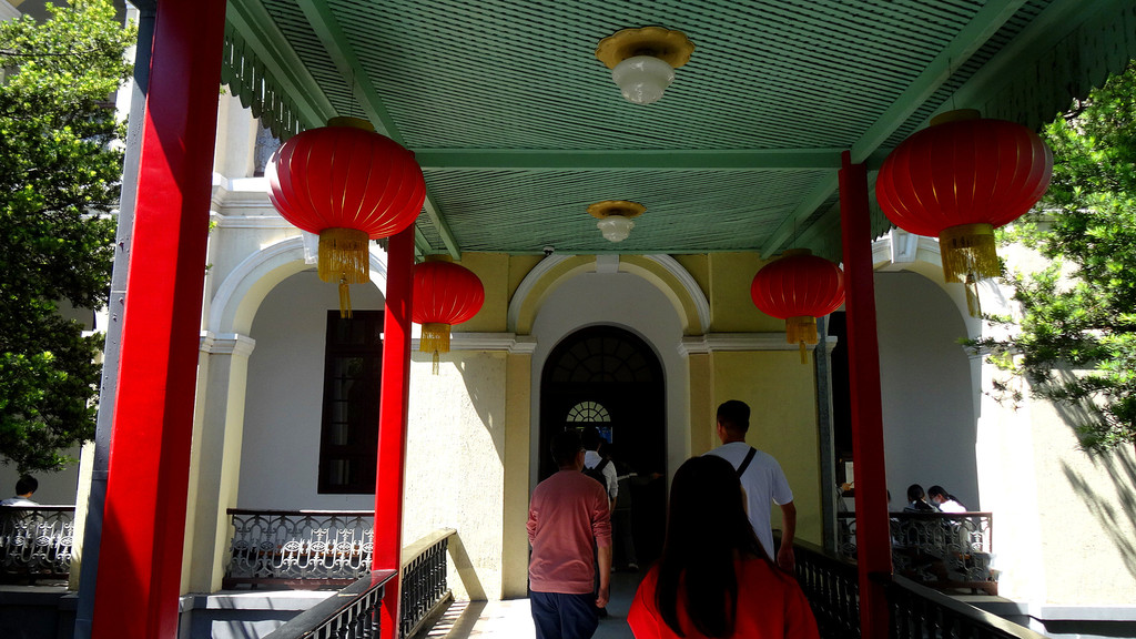 建筑很有特色,主体是欧式建筑,非常精致,走廊则有明显的中国特色,大红灯笼、走廊红色柱子以及走廊镂空格式,把中西方建筑元素完美的融合在了一起,给人既复古又现代喜庆的感觉。