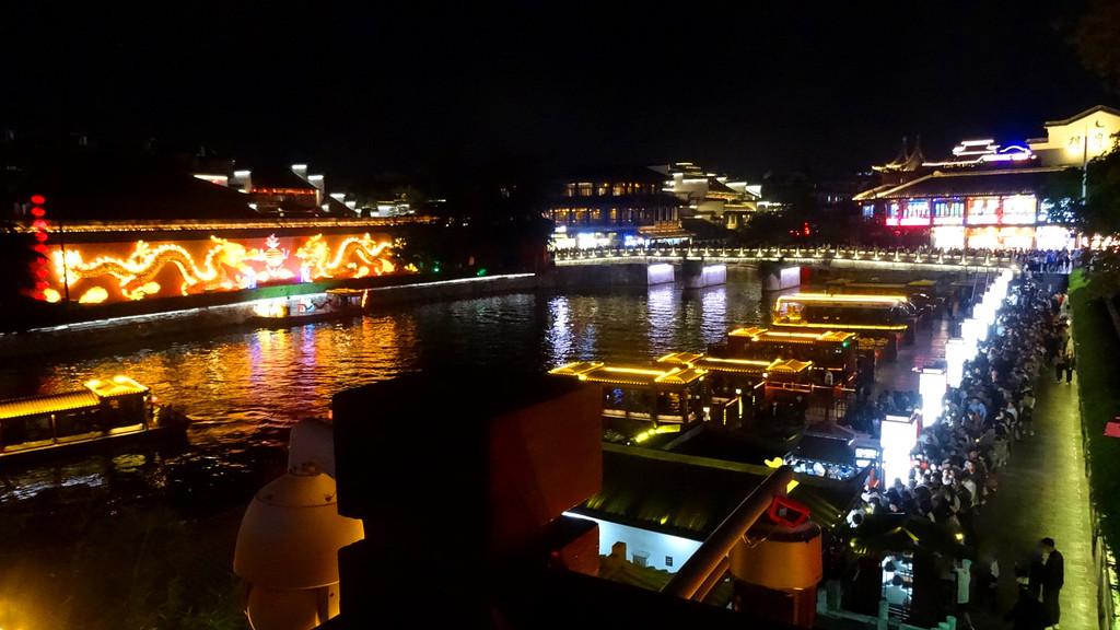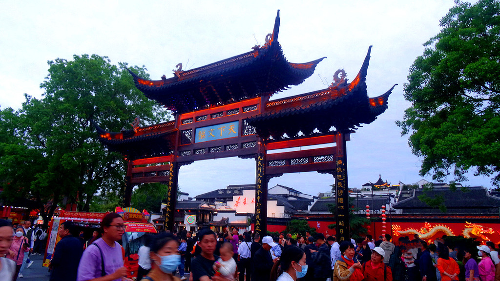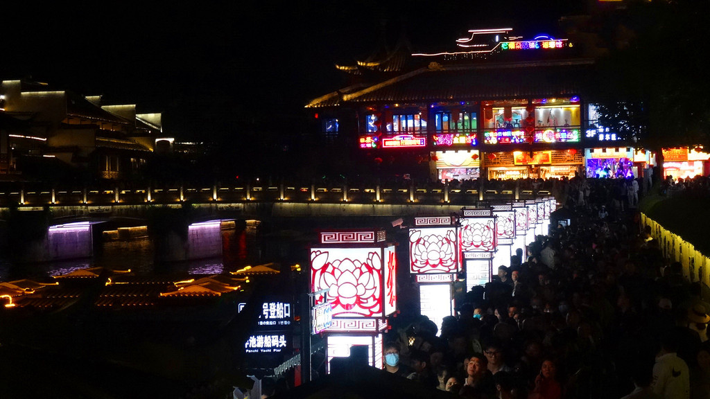 魁星阁下来步入今晚主题———乘游船一览十里秦淮。用人山人海形容人流一点不过分,也许疫情结束了人们需要释放自我,也许这个秦淮河实在名气太大了,栽的梧桐树引得游人自然来,但是秩序井然,人们自觉排着队,该谁走就谁走,没有出现拥堵、吵闹等情况,为我们所有人点赞。