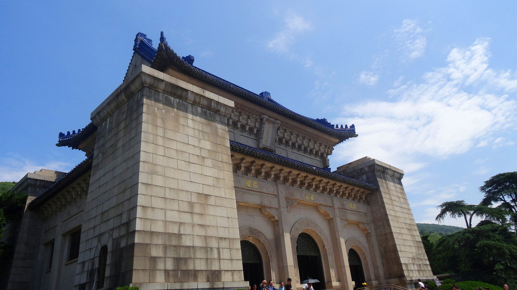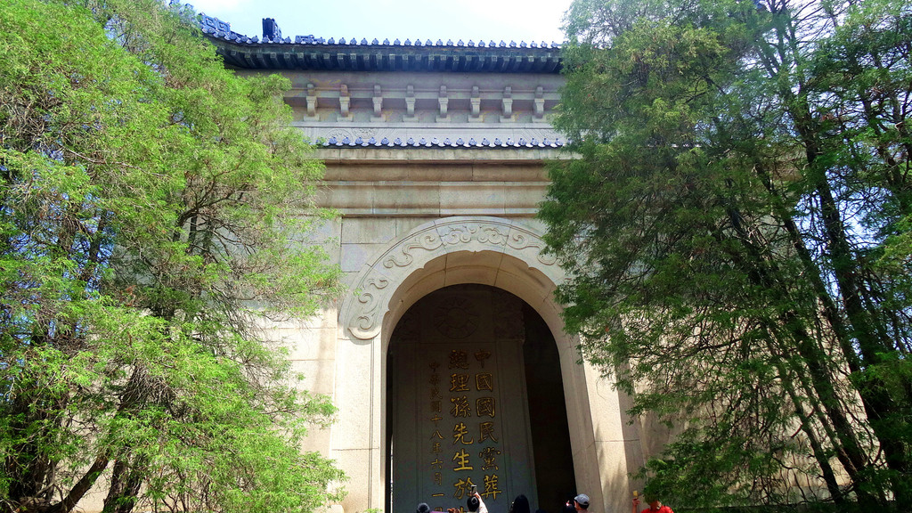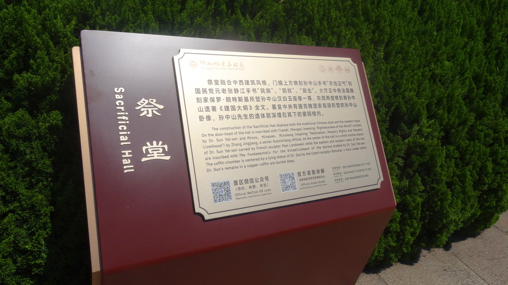 祭堂东西护壁大理石刻着孙中山手书的遗著《国民政府建国大纲》和胡汉民等人书写的《总理遗嘱》,穹顶上绘有巨幅国民党党徽。墓门关闭,无缘一睹孙中山汉白玉卧像。