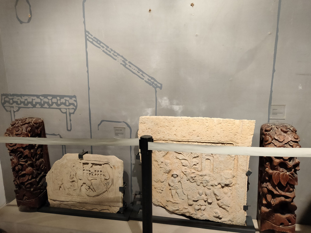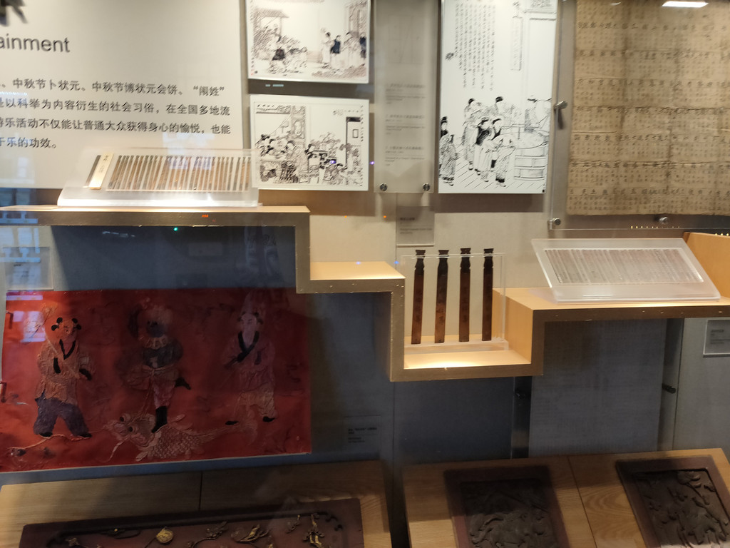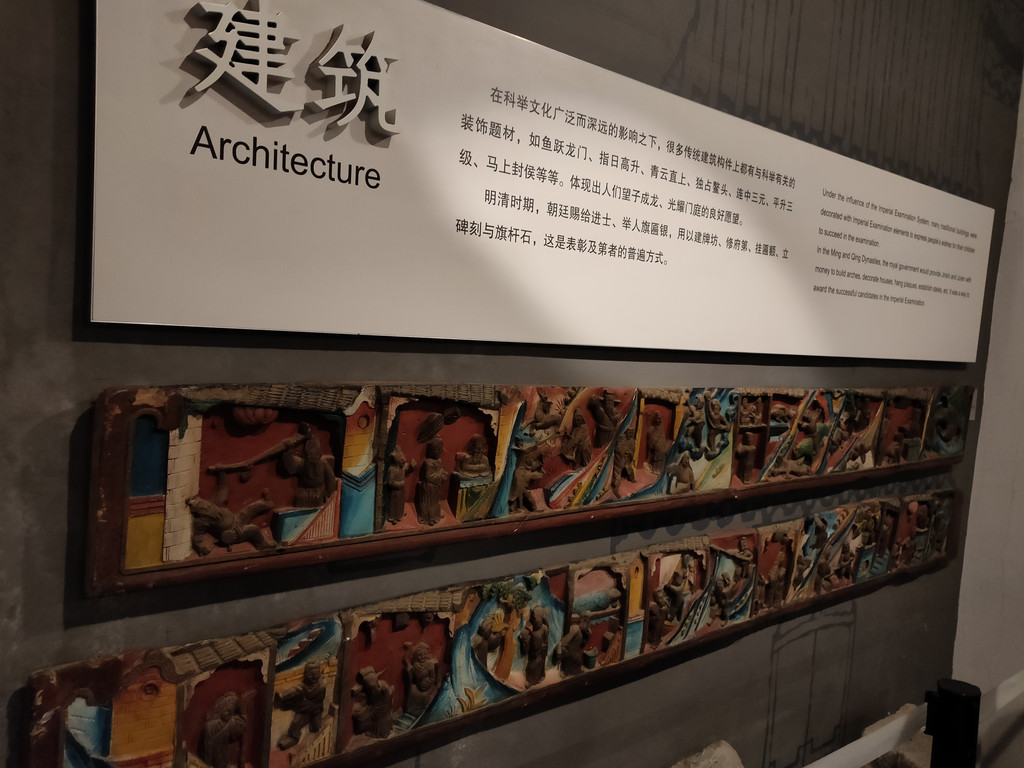 长廊里还陈列了一些建筑构件,很多都有着吉祥的寓意,像鱼跃龙门、直云直上、连中三元、独占鳌头、马上封侯等。在科举文化的影响下,很多传统建筑的构件上都会有与科举有关的装饰题材。明清两代朝廷会拨给进士、举人一些匾银,用于修筑牌坊、宅第等。而拿到匾银的进士和举人们,自然对朝廷感恩戴德,这些与科举有关的题材,就成了建筑时必不可少的了。