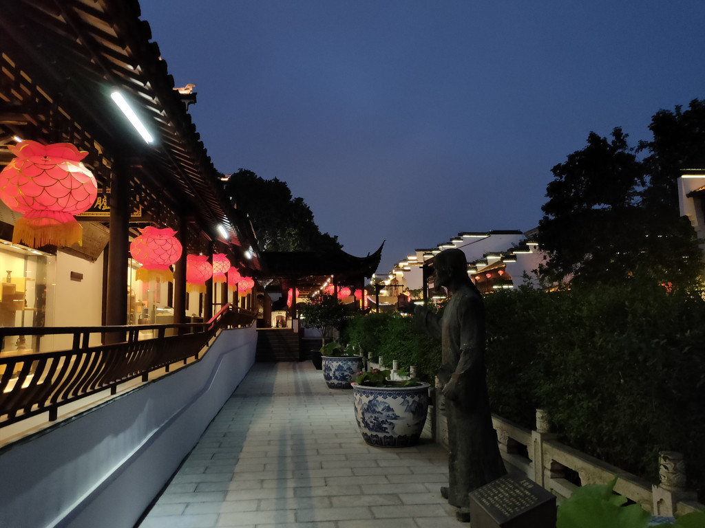 返回的时候,我们沿着秦淮河走,这里还有唐寅和吴承恩的雕像。不过晚上即使有灯,还是有些黑暗。秦淮河对岸倒是灯光璀璨,显得这里更加灰暗了。贡院门口还有林则徐的雕像,这三位应该是江南贡院走出去最著名的人物了,但都不是状元。