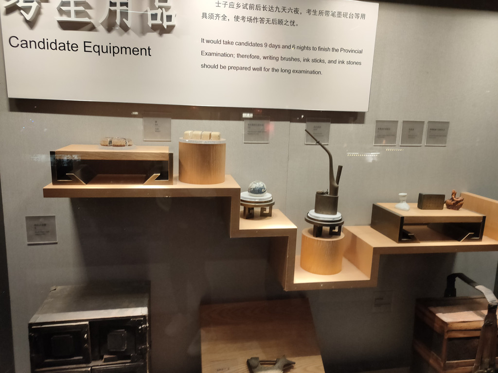 陈列的考试用品挺有意思,品种繁多。毕竟要在号舍里呆九天,笔墨纸砚固然不可少,干粮也需要备足。
