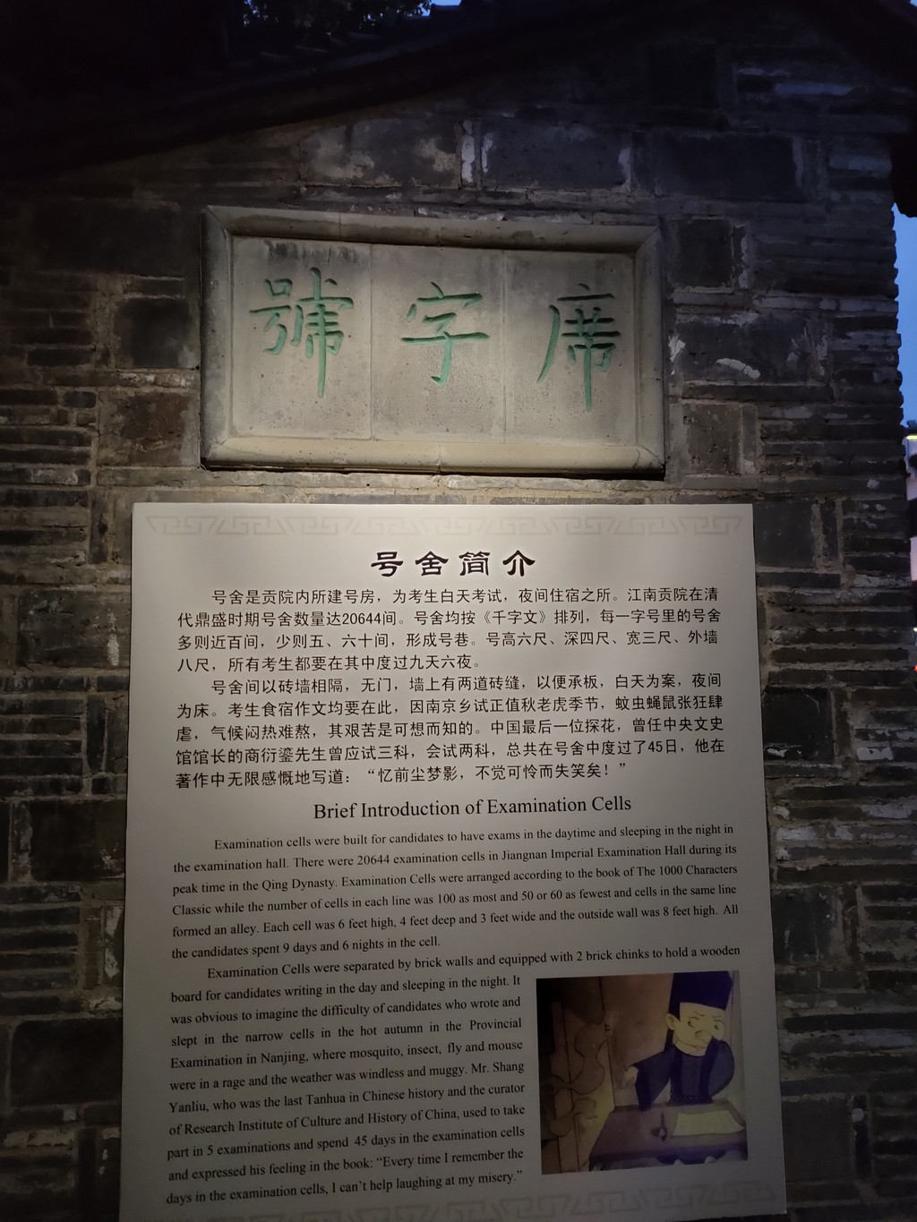 旁边有状元、榜眼、探花的牌匾,这是殿试的前三名。另有一溜关于考试的说明,居然一眼就看到了郭子仪的名字。我顿时茫然:人家是唐朝人,那会儿还没江南贡院呢!