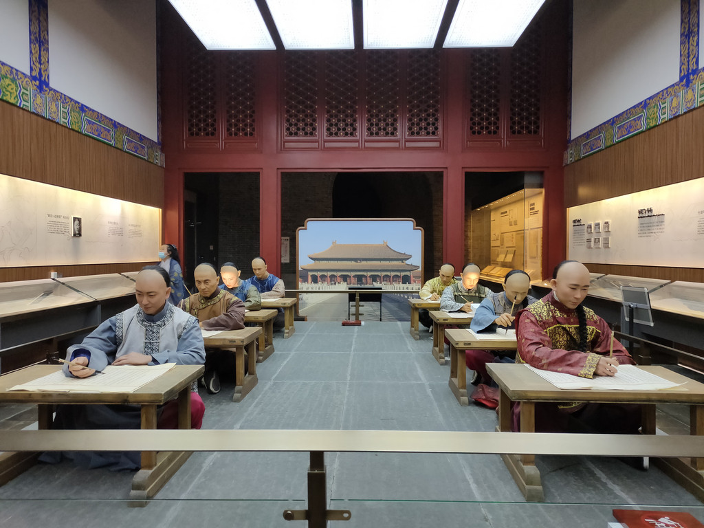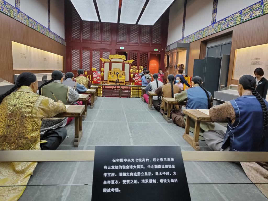 下面是殿试的场景复原模型,这可不比贡院的房间那么狭小了,因为不用考九天,皇帝也没那功夫,所以跟今天的考试没啥两样。只是考生们席地而坐,而我们有椅子罢了。不过人家的桌子比我们的长,因为以前的策论可能写的篇幅要更长一些。