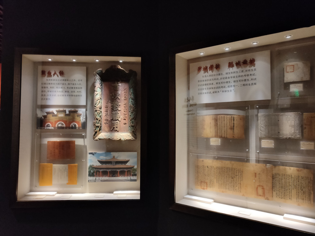 第二展区“鱼龙变化”,童试、乡试、会试、殿试,介绍了古代取士的程序,贫寒人家的学子们经历一场场考试以后,才能出人头地。生员入学以后分为廪生、增生和附生,所有的生员都需要参加岁试与科试。岁试由学政主持,成绩优异者附生可补增生,增生可补廪生。科试是选拔生员参加乡试的考试,成绩列一、二等的生员,就有资格参加乡试,被称为科举生员。
