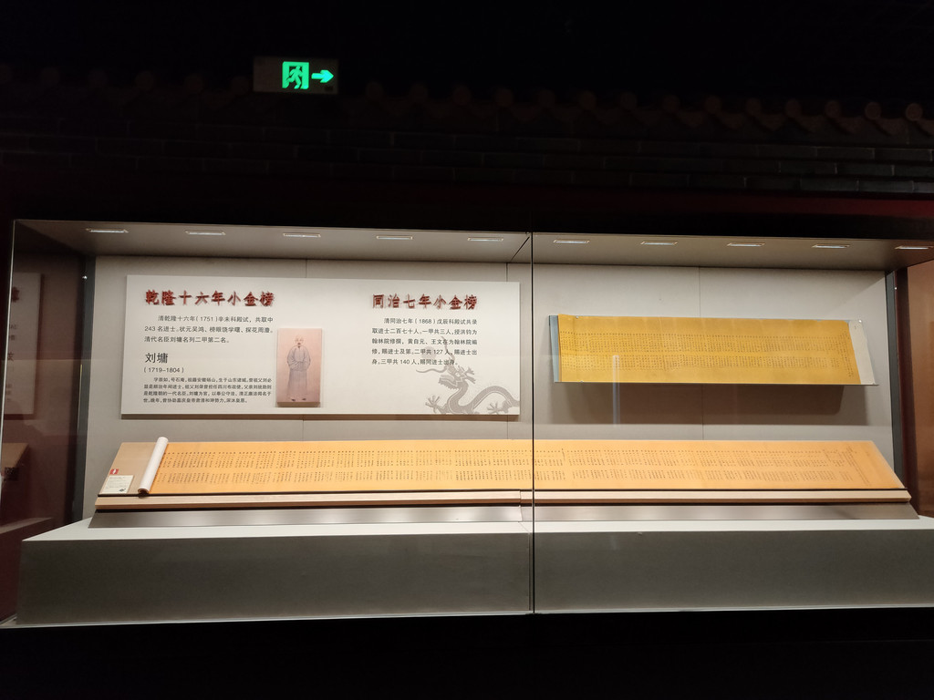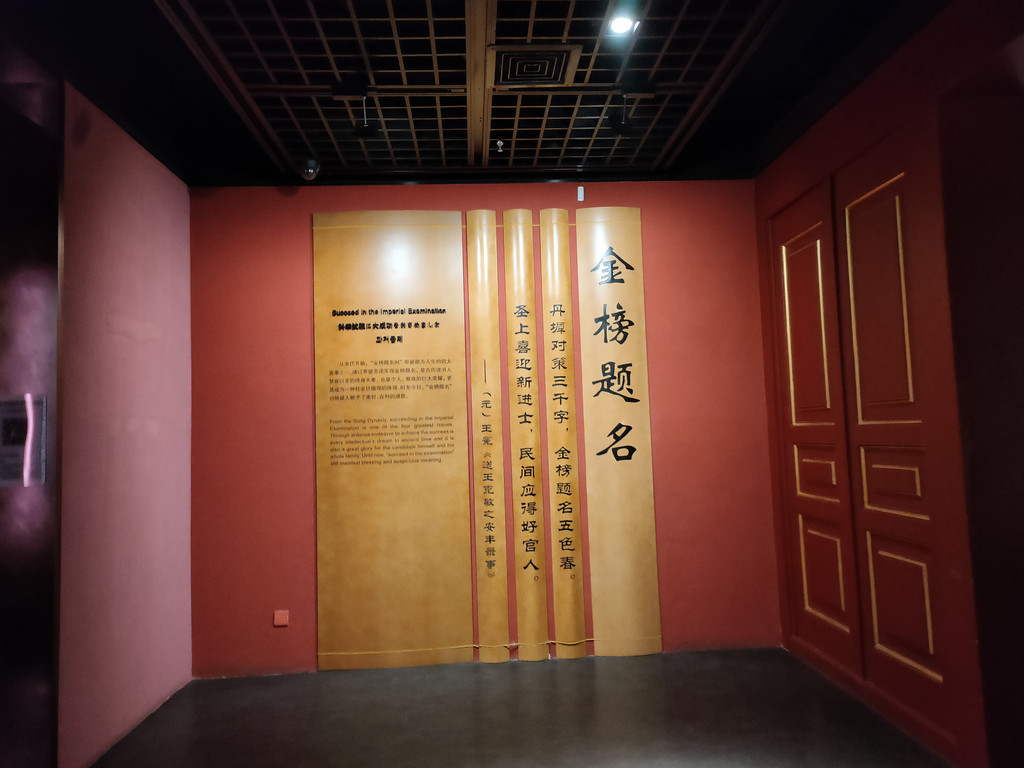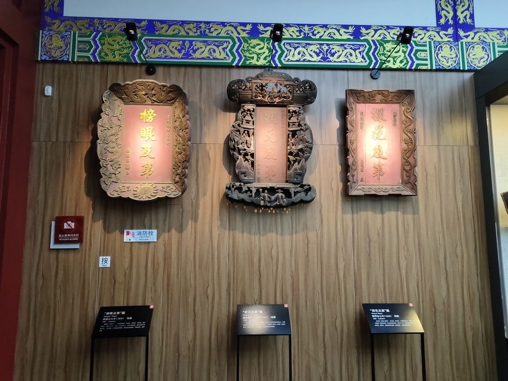 墙面上有三块牌匾,正中是“状元及第”,两侧分别为“榜眼及第”和“探花及第”,这是殿式一甲,也是全国士子中的佼佼者,那是要跨马游街的,可谓荣耀加身,前程似锦。说起来,中国的科举制度对于贫寒学子来说,确实是飞黄腾达的唯一路径了。要知道,在魏晋南北朝时期,贫寒学子是不可能进入政治中枢的。隋炀帝着实冤得很,明明创设了后世承袭了一千余年的科举制度,在历史上却偏偏没有留下什么好名声。只能说,历史是胜利者书写的,成王败寇,这就是结局。