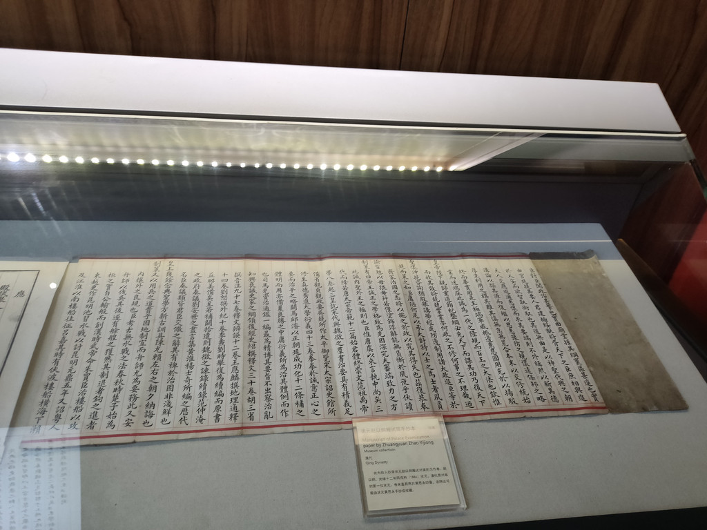 赵以炯是光绪十二年状元,是清代云贵地区夺魁天下的第一人。展区陈列了赵以炯殿试对策的手抄卷,全文是馆阁体,卷末有两方黄思永的印章,这份抄本可能是黄思永手抄的。按说作为曾经的状元,不应该担任誊抄的工作吧?或许是因为赵以炯的这份对策让黄思永见猎心喜,因此手抄此卷私藏?