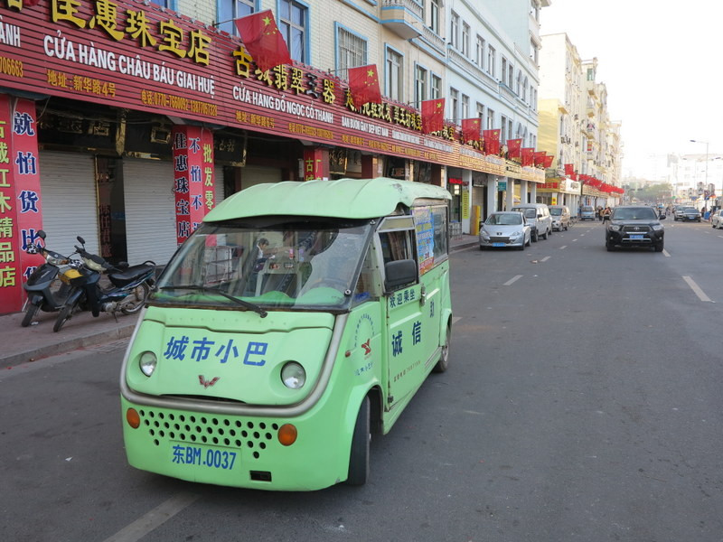 原先想在东兴住一晚,一来没啥好玩,二来担心第二天过境中午会赶不到下龙湾,延误我们的行程,越南的不确定太多了。吃完饭,沿着路边随意走走,大年初一很多 商店不开,但这里依旧热闹,东兴没有大的公交,都是小型的环保车,路边的边贸大楼门口写着“中越友谊,万古长青。”
