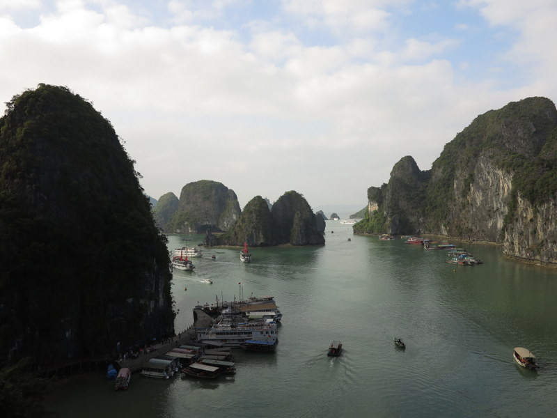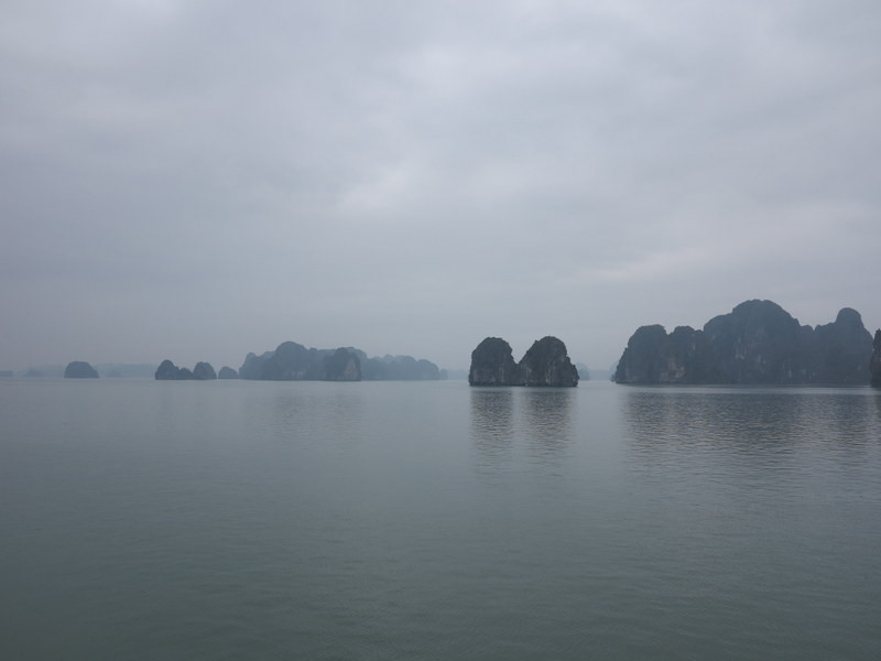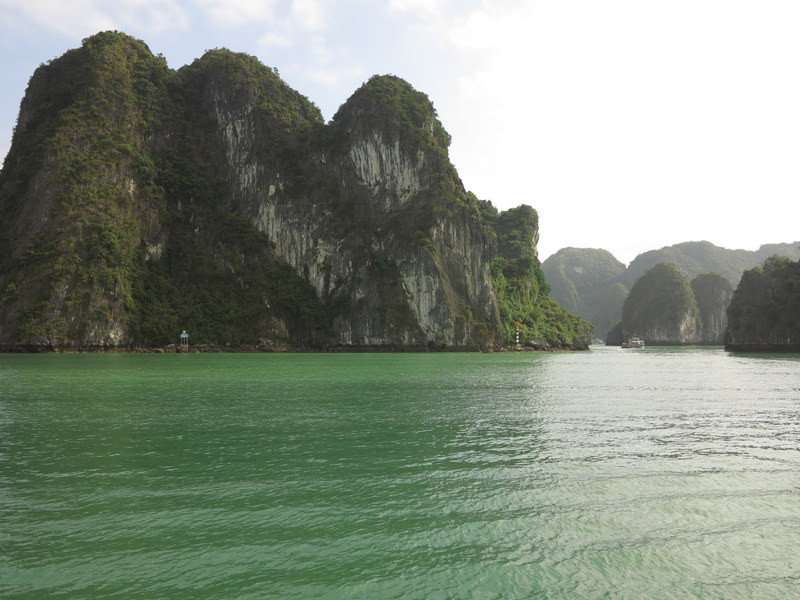 导游及时通知开饭了,一顿还算丰富的越南菜肴,游船一路往外开,下龙湾其实也就在北部湾区域,这里有大量的伸出海面的石灰岩柱,还有一些洞穴和洞窟,共同形成一幅异国风味的如画景致。