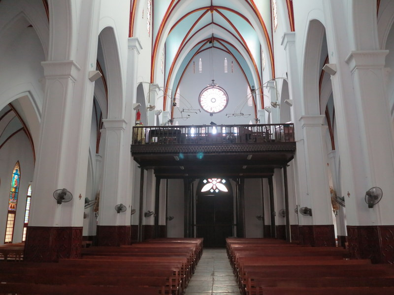 教堂的大门只有在举办弥撒时才会打开,其余的时间,游客只 能从侧面进入,和老婆步入教堂随意看看。这里是河内最古老的教堂,据说是仿巴黎圣母院兴建而成,建于1886年,属新哥德风格,由两位彩劵商所赞助兴 建。教堂内部依旧是高大宏伟,彩色玻璃窗,煞是好看。教堂对我和老婆来说谈不上震撼,只能是到此一游。
