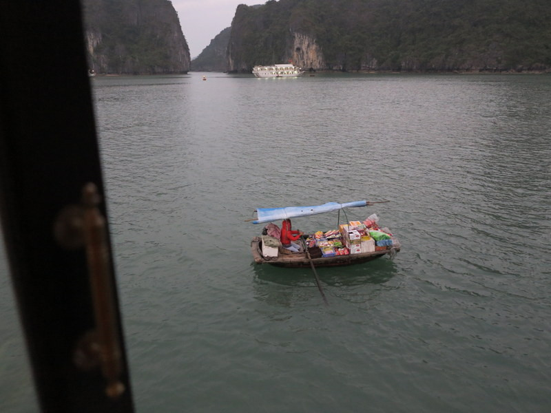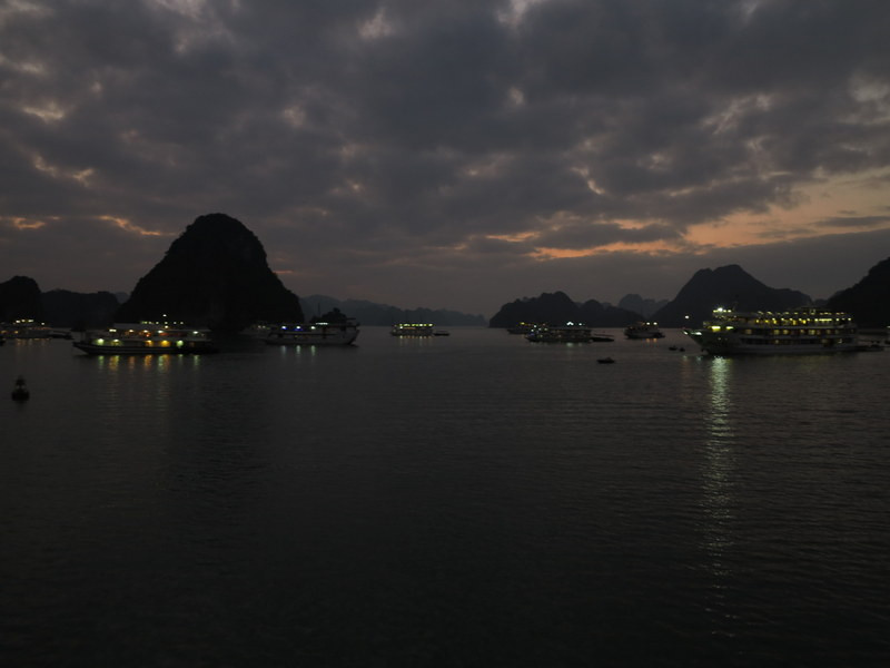 回到船上,不久就是晚餐,依旧是越南菜肴,我和老婆还是喜欢的。吃好晚餐,甲板吹风,看看周围游船不少,这里就是晚上游船的停泊水域,不时有买水果的小船 划过来作生意,几个带小孩的家庭,在船边海钓,由于季节问题,一条鱼也没有上钩。