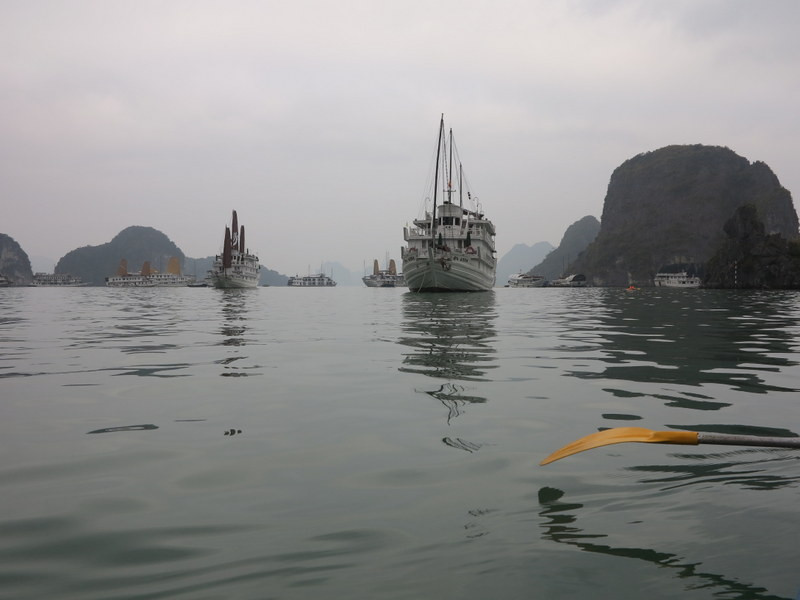 看着星星,望着其它船的灯光,除了睡觉,没有其它事情了。第二天天气还是一般般,和老婆每次出门天气总是不算太给力,习惯了。一早吃好早餐,无所事事的我们去惊讶洞附近划皮划艇,不错的体验,比较随意和自由,自己 划船去了我们想去的岩洞,还受到同船老外夫妇的帮助,那对老外每人带一个孩子,一个人划,比我们快很多,看来是练过啊!