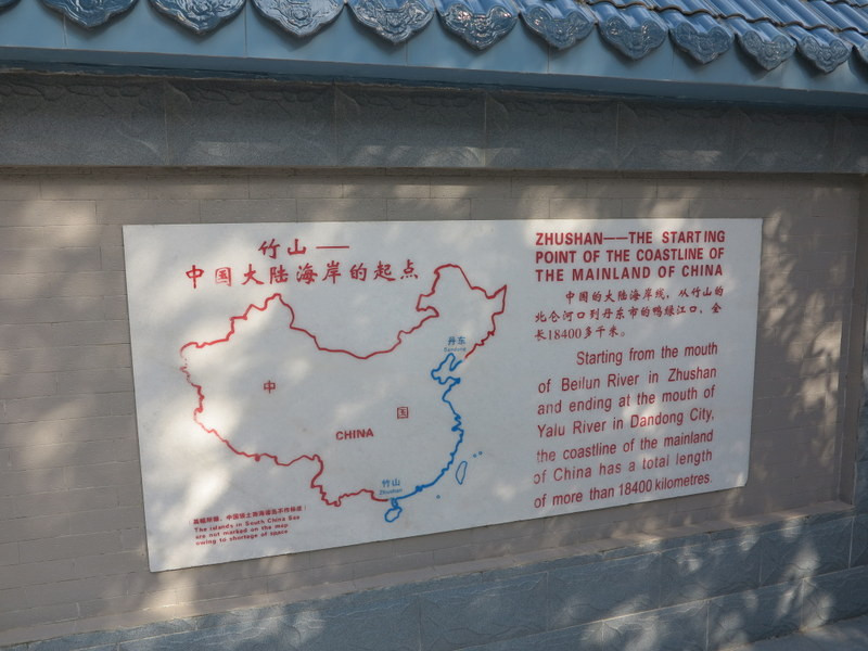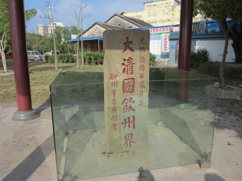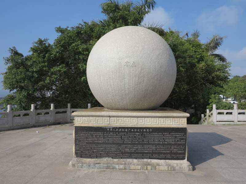 这里虽然说是景区,但没有门票,随意参观,面积也不大。左边有个亭子,里面保护着一块沧桑的界碑,正面写着“大清国钦州界·知州李受彤书·光绪十六年 二月立。”1885 年6月9日,清政府和法国在天津签定的《中法越南条约》,条约规定,两国边界自竹山起界,循北伦河自东向西,以河心为界线。防城港市与越南的边界线,从竹 山的北伦河口至峒中的北岗隘,长200多公里,全段以石碑为标致,共立1至33号界碑。其中以河为界的,双方各于已方河岸相对立石,以山为界的则 双方共立一块界碑,一面书“大清国钦州界”(当时防城属钦州府辖),一面书“大南”(即越南)。 竹山一号界碑位于东兴镇竹山村的北仑河入海口,碑石是用坚硬的海石凿成,当时竹山属钦州所辖,故名“钦州界”。老婆去过丹东鸭绿江口,这次来到北仑河口也 算是边境游览的一个圆满。这里也是“远方的家”边疆行的起点,界碑边上的白墙上有着对中国边境的一些介绍,这里游客不多,对于喜欢地理标志的我们,也算值 得一看。