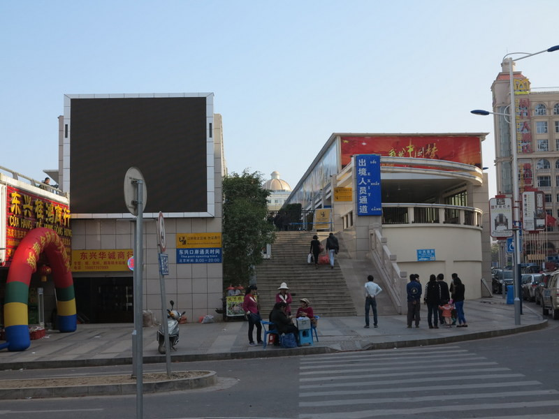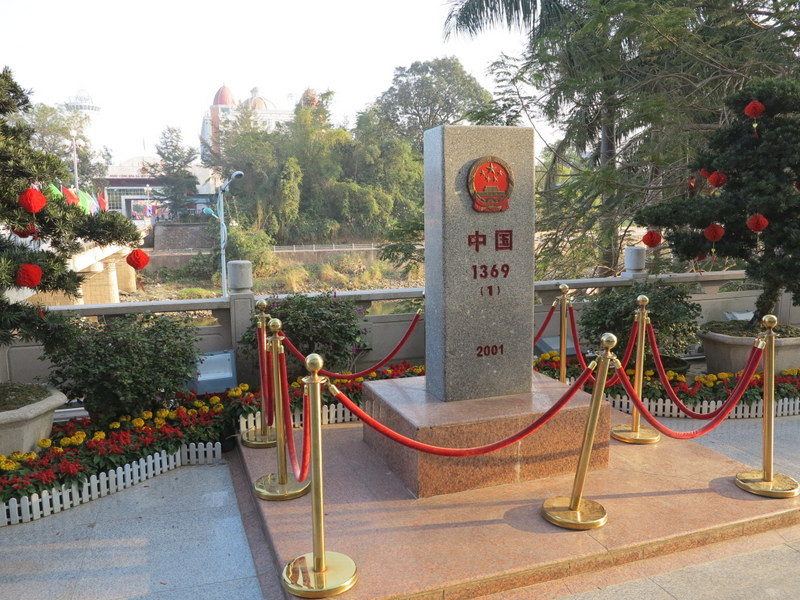 走几步就到了北仑河边,河的对面就是越 南,后头看看东兴的国门,两边也就一座桥连着。回到过境通道前,在一个大妈手里换了500元人民币的越南盾,一串的零,又花了45元,大妈一条龙的搞定了手机的越南上网包月功能,后请工作完毕了,可以过境了。东兴口岸可是仅次于罗湖和拱北之后的中国第三大陆路口岸啊!下午过境不要排队人也少,据说一早大家是要排队过境的,边民都要去做生意。通过中国海关,漫步在北仑河的桥上,和中国的1369号界碑合影,桥的中线就是中越国界,第一次陆路口岸过境。