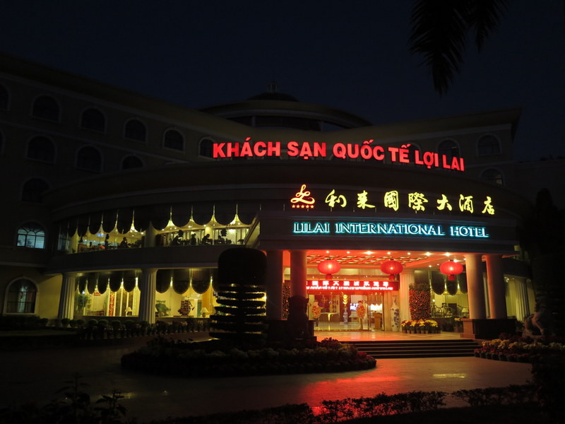放好行李,徒步去汽车站看看,一张越南文的告示贴在门上,大年初一汽车站都是关门的,好在初二就正常 了,看着越南文告示,由于越南文完全是拼音,我们连猜带想,外加老婆的手机字典,居然看出了第二天班车秩序的大概的意思,随手拍照回去让酒店小哥看看。街上没有吃饭的店开门,直接步行去这里的DC酒店—利莱国际大酒店,这里据说是香港人经营的,全越南两个DC之一就在这里,只对外国游客开放,越南人不能进去,其实主要就是中国游客啦!内部服务员全中文,游客基本也是中国人,毫无障碍啊!我们直接去了一楼的餐厅,几个大桌上都是中国人,居然还有好几瓶茅台 的,上海话也不在少数,浓浓乡音啊!点上几个越南的菜肴,一百五十元人民币,这里就是喜欢人民币。