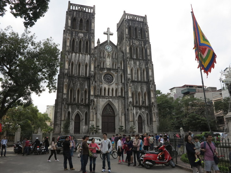 跨过越南的铁路,穿过教堂边的小巷,居然发现这里有不少很有名的旅店,教堂灰黑色的外贸很沧桑的感觉,开始门口人不多,但没 过多久大量的电瓶车开了过来,成堆的游客蜂拥而至,原来这里下午2点开门,大家都算着时间来的。