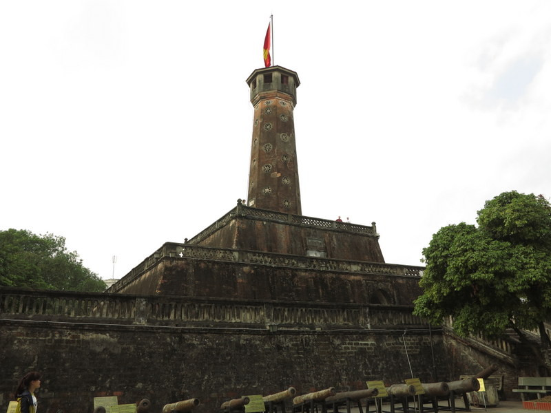 坐着休息一下,看看马路上的三轮车,背后就是旗 台,这里属于军事博物馆范围,广场上还有不少飞机残骸,越南是个不断战争的国家,也真不容易。喝完咖啡吃完法棍,直接进入旗台,居然门票也省了。不想看博物馆,就看看旗台,旗台是河内著名的古老建筑,它是越南阮朝举行庆典升挂旗帜用的,现飘扬的是越南国旗。河内旗台是阮世祖(嘉隆帝)阮福映灭西山朝 统一越南后,为张扬一统王朝的气派,下令修建的。于公元1805年(阮世祖嘉隆四年)动工,1812年(嘉隆十一年)落成,界线180米,通高达31米, 有三层平台,上面的塔柱高18.2米。一层有宽大的台阶,二层三层四面有拱形门,拾阶而上,第三层基座的拱门上镶嵌着大大的“迎旭”两个汉字。
