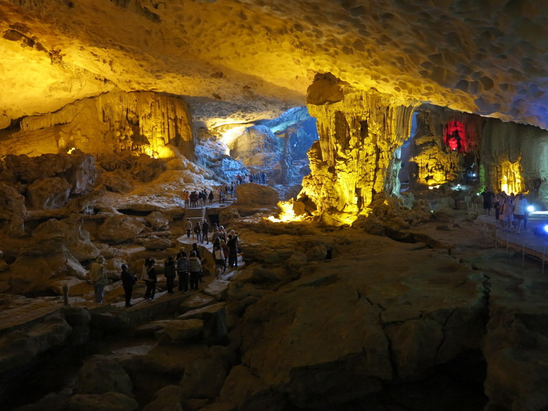大船开行到下龙湾深处,会用小船把我们拉到游览的地点。惊讶洞是今天的景点,越南文化比较直白,据说由于这里的居民由于躲避风暴,发现这个在半山腰的溶 洞,进入后发现很壮观,极其惊讶,由此得名惊讶洞。