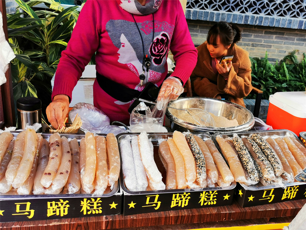 马蹄糕是闽南地区的传统甜点小吃。相传源于唐代,以糖水拌合荸荠粉蒸制而成。其色茶黄,呈半透明,可折而不裂,撅而不断,软、滑、爽、韧兼备,味极香甜。