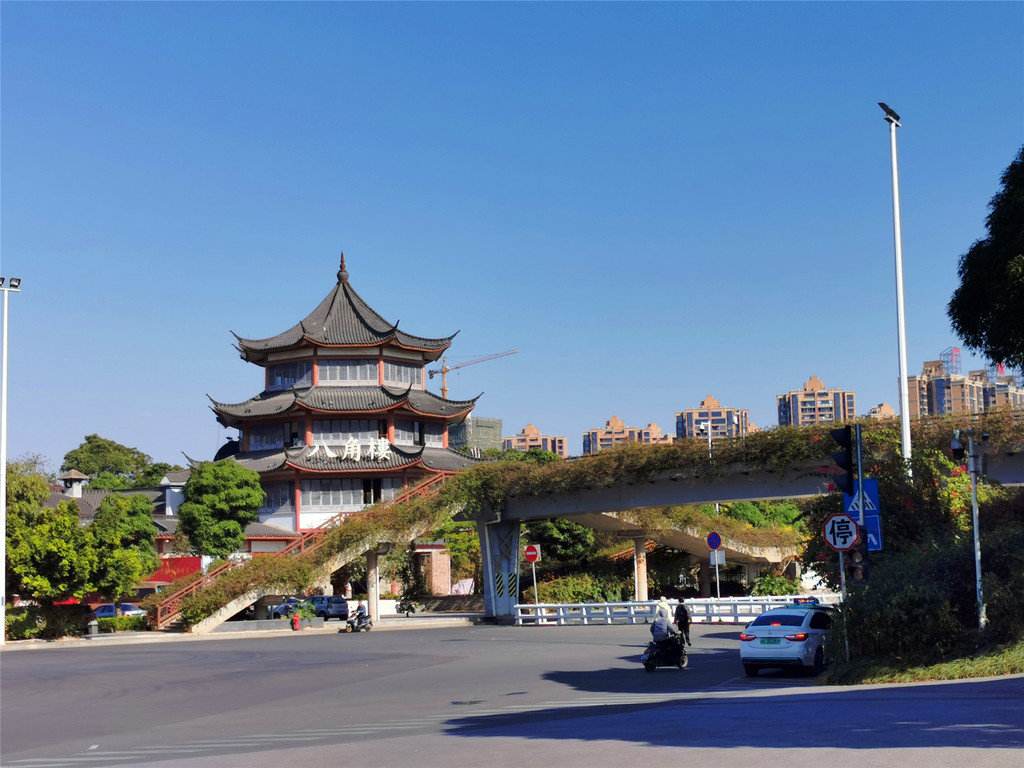 地铁管对面的八角楼,没做功课,不知道是新楼还是老建筑,过街天桥的绿化蛮有特色的。