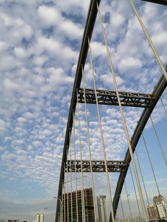 当晚,我要去江南万达金街,焗一品的老板请吃饭。路过教育桃源路口时发现天空太美了!上了凌铁大桥,更美了,鱼鳞云、湛蓝的天空,还有邕江的落日,凌铁大桥的铁架,结合在一起,真是让人难忘的美景,我忍不住停下来,用手机记录下这奇异的天象。