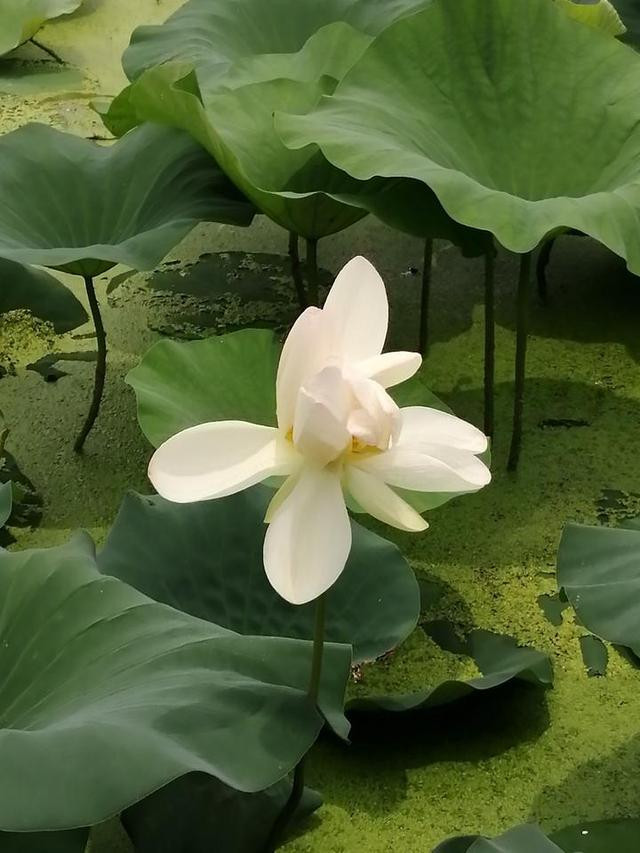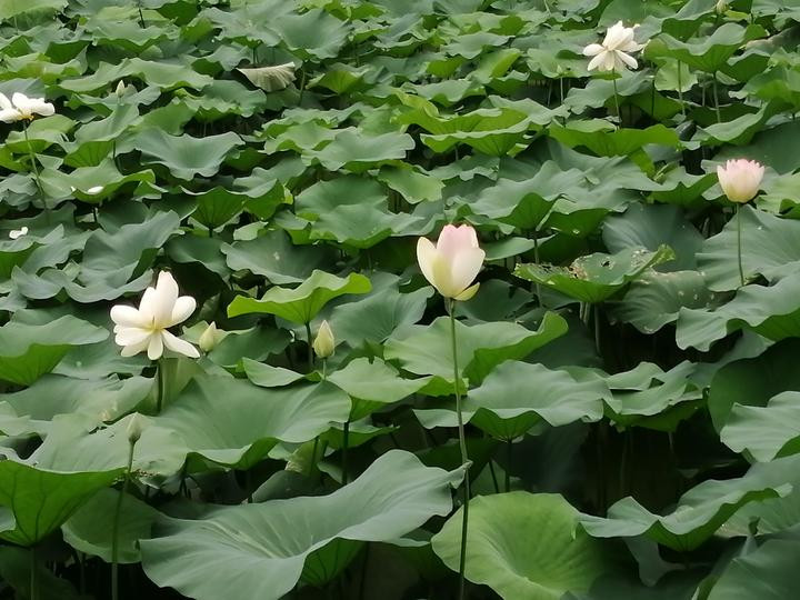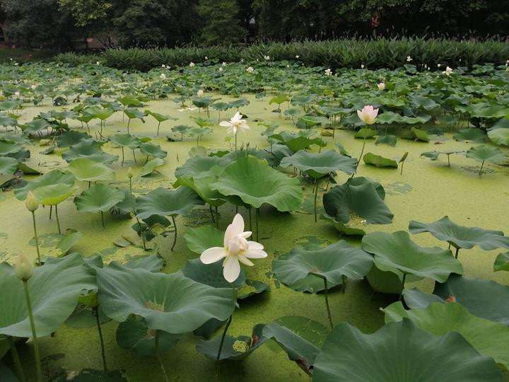 从老橡树鸽都行餐厅大厅出来就是狮山公园,这里有一条长满荫生植物、绿树成荫、凉爽怡人的路,走在这里有着清新的花草味。一直向山下走,突然发现路两边都是湖,一个大的,一个小的,小的湖应该就是荷园了,长满荷花,荷叶绿油油的很诱人,当中点缀着很多盛开的荷花,白色、粉色的等,娇艳欲滴,还有很多含苞待放的花蕾。