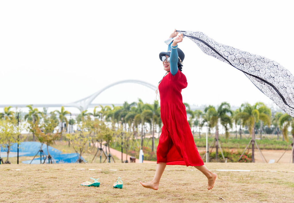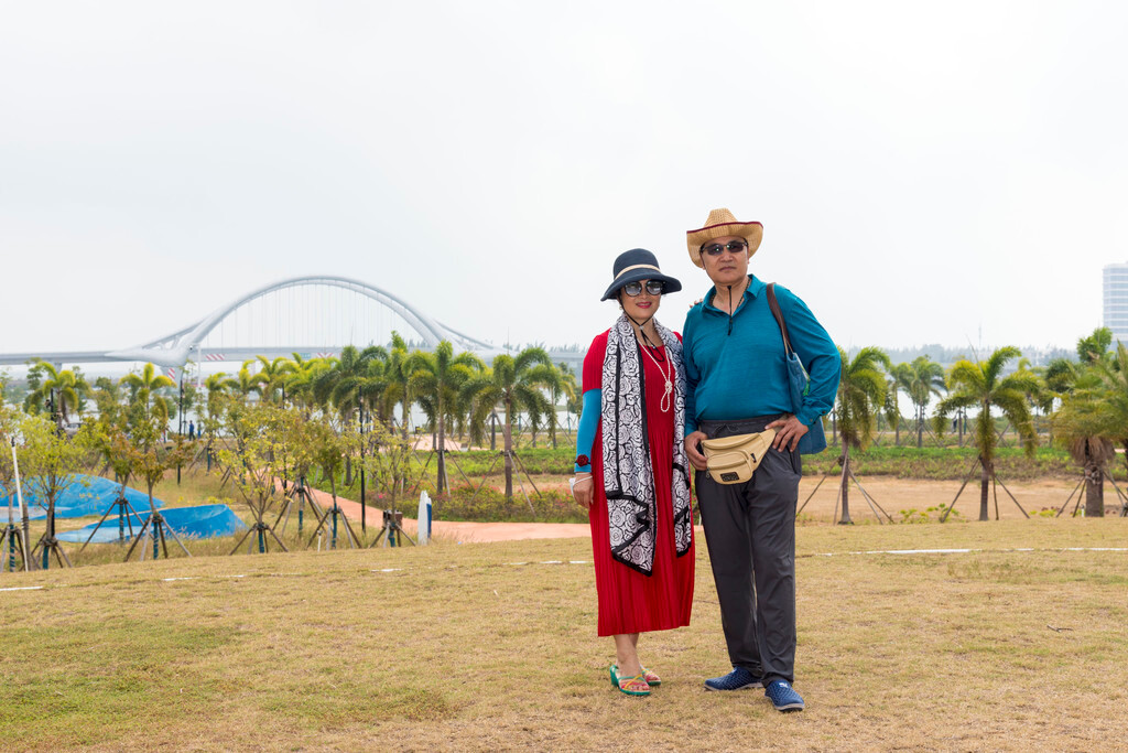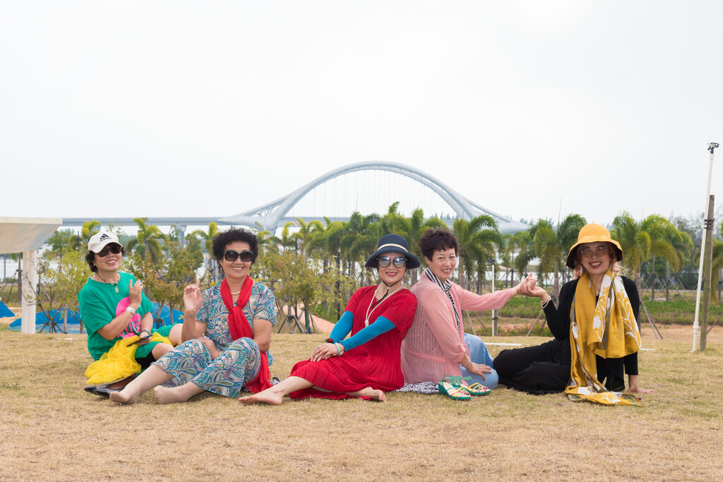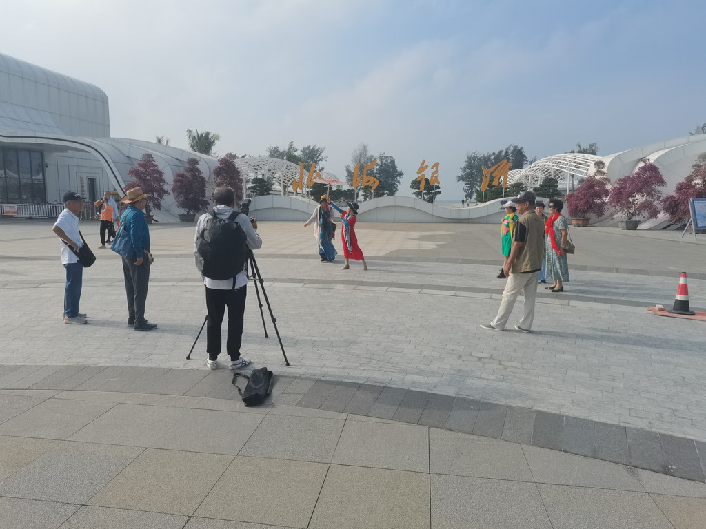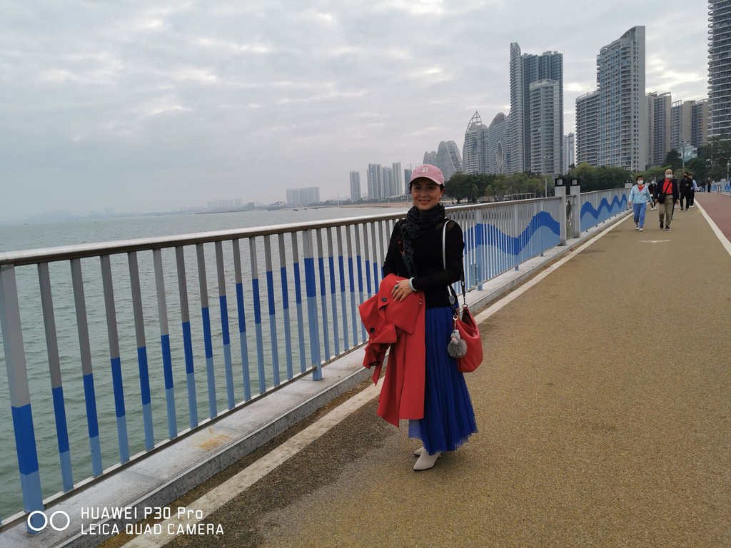 我们骑上电动车半小时到达金滩的海景广场,这里一望无际的大海开阔无垠,绿荫下的广场上人们散步娱乐,还有锻炼身体的广场舞和太极拳。走在观景栈道上,一边是浩瀚的大海,一边是海边高耸林立的大厦,桥上红黄蓝白相间,红的是过去的步道,黄的是过来步道,蓝的白的是桥面围栏颜色,有人漫步有人垂钓有人拍照有人直播,好不惬意。