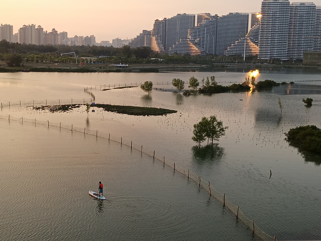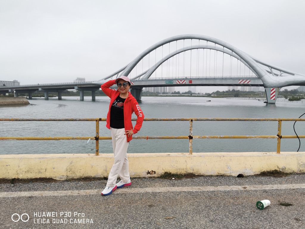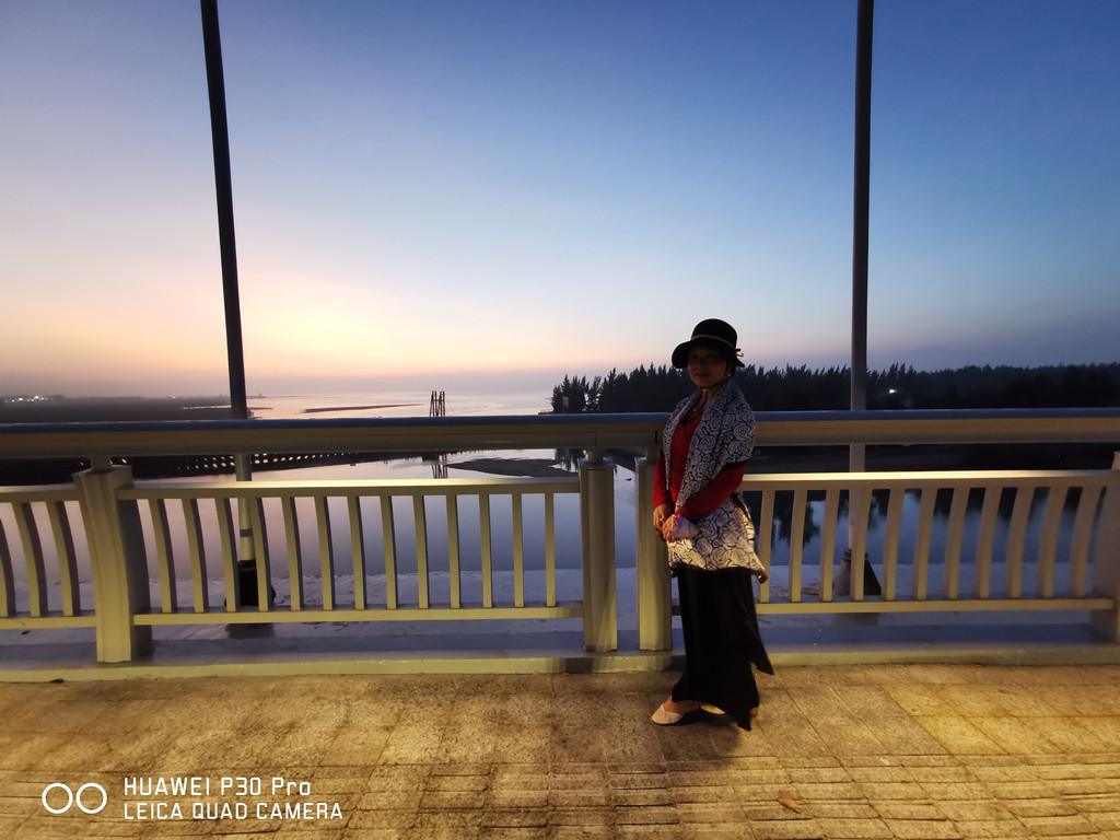 午饭后回去休息了一会,再骑行20分钟,来到了又一个新近修建完成,并通车的冯家江大桥。大桥全长957.194米,桥梁工程为650米,路基长度为307.194米。位于银滩东片区、冯家江出海口附近,总投资约3.8亿元。是连接冯家江南北两岸的重要通道,也是联系银滩东片区滨海旅游观光带的主要通道之一。侧观大桥如彩虹飞舞,横跨大江两岸;纵观如如云飞龙,直冲云天。站在桥上欣赏两侧景色,更是美不胜收,一侧是冯家江入海口的开阔博大,红树绿映海水蔚蓝;一侧是海映楼宇鱼人悠闲,好一派江南盛景。晚霞中更是一派夕阳无限,未来满天的美好景象。