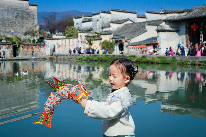 相隔九年,又一次走进画里宏村,依旧如同一墨泼来,黑瓦白墙的马头墙错落有致,坐落在一片山水之间,还是一如既往的喜欢徽州,喜欢这水墨宏村,这一次带着小可爱,穿上马面裙,融入了这幅画中。