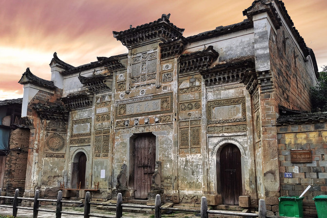像我们来的邹氏祠堂,就是非常有代表性的,祠门以幔亭造型,对称布列梯式砖雕图案,为体现中国家族敦本传统,特饰有“木本”、“水源”这篆刻书法两幅,意即家传宗法血缘有如木之本、水之源,生息相关。