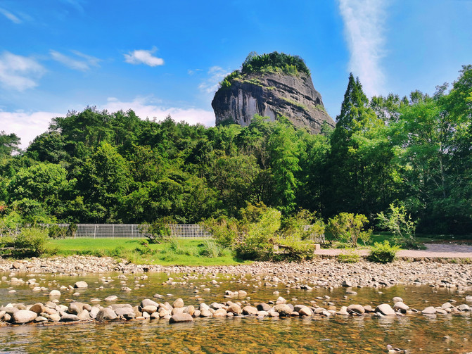 从幛岩附近的浅滩至齐云峰下的星村镇,就是九曲,九曲尽头是星村,主要景点有:齐云峰、白云岩、双狮戏球石等。它们整体形成九曲清溪绕青峰的美妙景观,一般游览的主要方式是九曲溪漂流,乘坐竹筏泛溪观赏山景。唯愿岁月安好,享受大自然的赐予,珍惜似水流年的日子……
