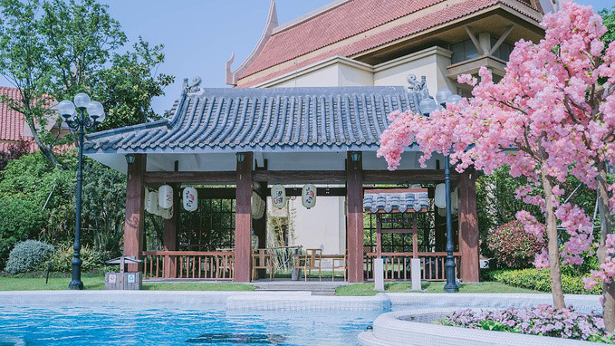 主馆后面是室外温泉,日式樱花温泉,红酒汤、瓜果汤、艺伎表演台,仿佛置身日本,来一场泉海之约。