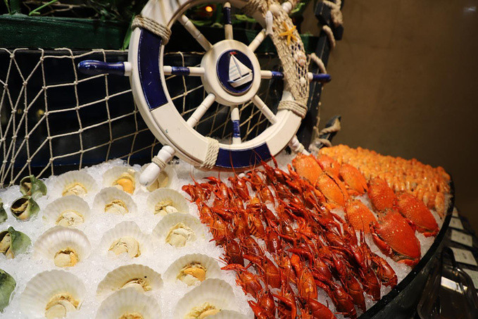 玩儿嗨了肚子饿的咕咕叫,正好天色也晚了,直接去了酒店主楼的西餐厅,叫艾葳格兰西餐厅,当季主推龙行天虾自助,除了龙虾外还有海鲜、甜点、烤制肉类等等,可以大快朵颐,饱餐一顿!