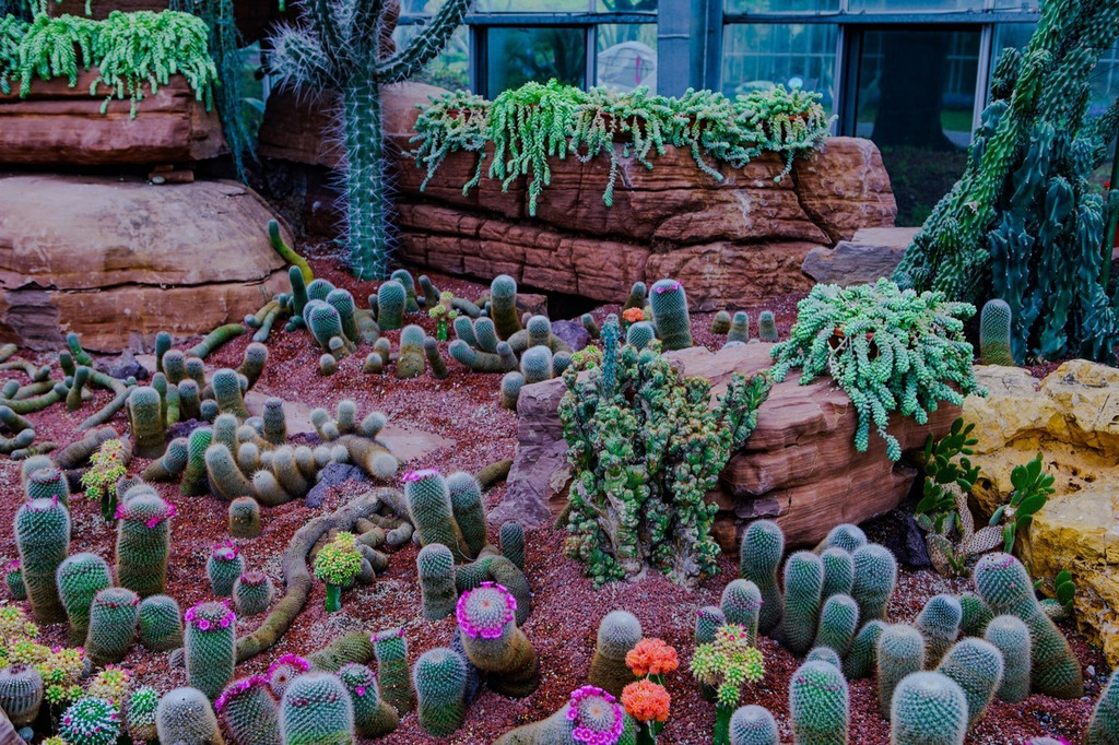 这里汇集了世界上所有生态型的沙生植物,也是目前国内品种收集最为齐全的沙生景观温室之一。场馆的布局主要按仙人掌类,附身沙生植物,块根类沙生植物和传统多肉植物等四个主题展示。采用了 中国 传统的园林设计手法,植物景观由低到高,路面曲径通幽,一步一植物、一步一景色。