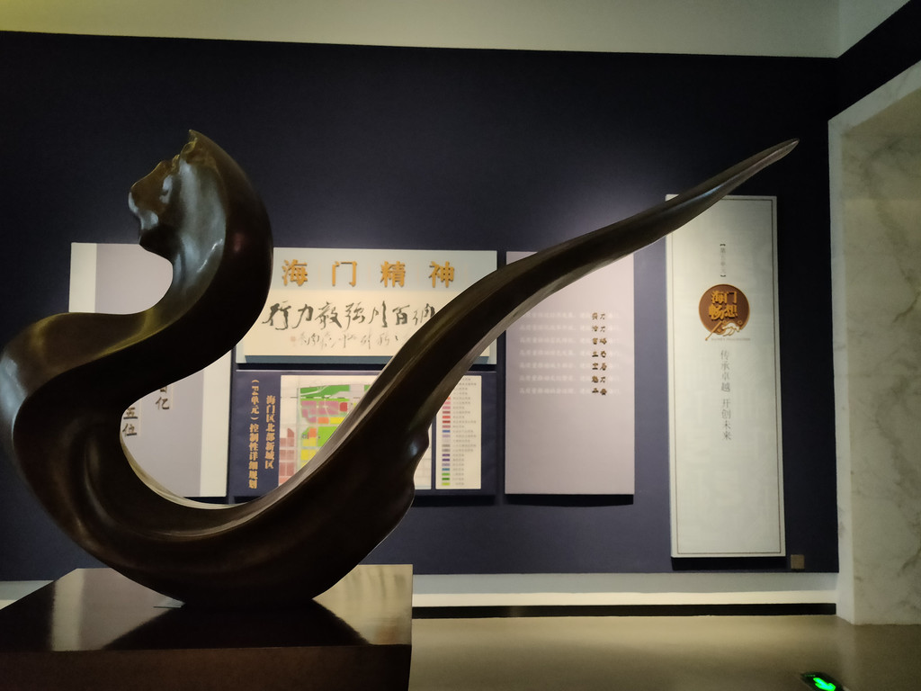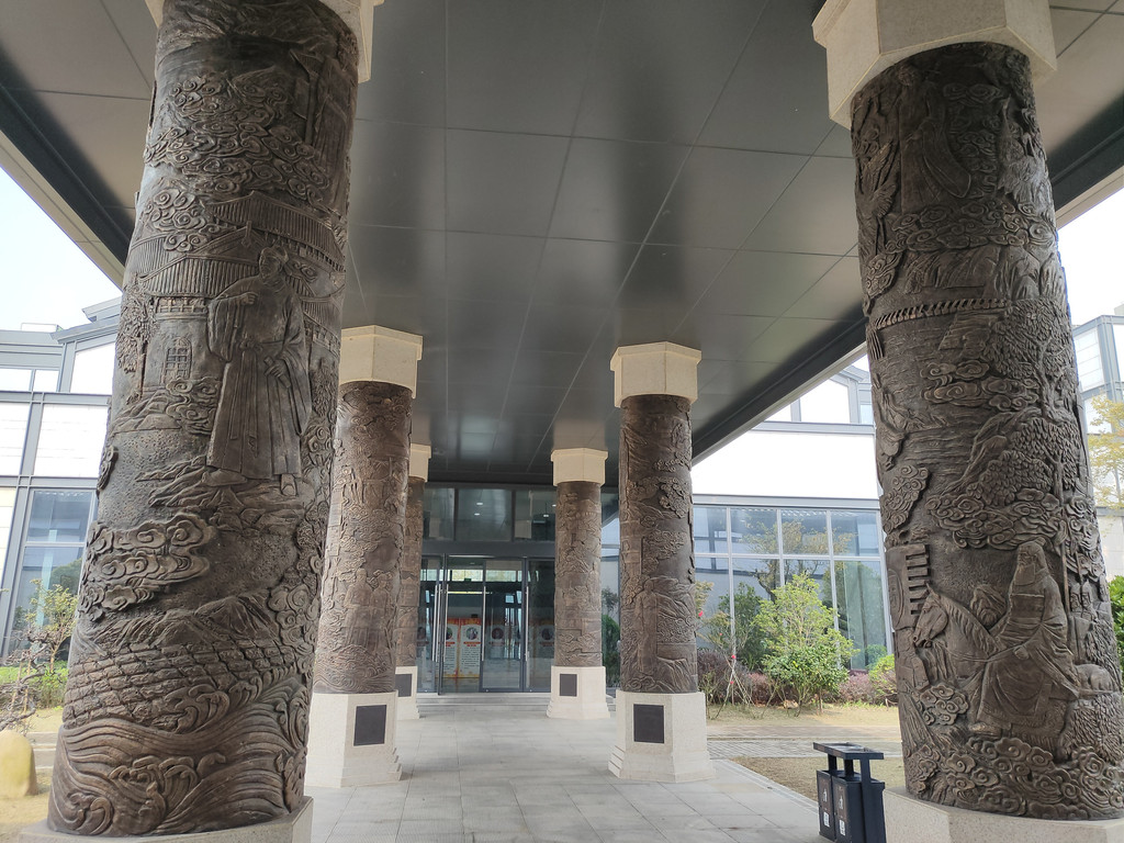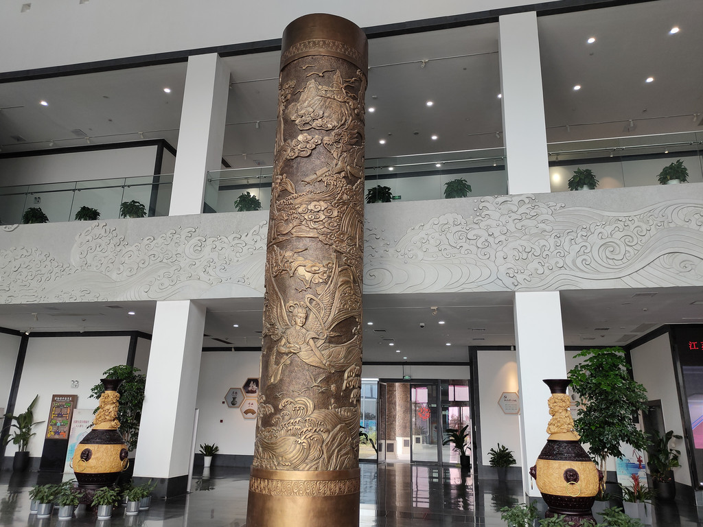 连接南北大厅的走廊区域有六根浮雕柱,这是《千年海门》主题浮雕文化柱,分别以“生于江海、县治四迁、盐为根本、沧海桑田、创业家园、风气之先”为设计发点,将江海文化的进取型、外向型、包容性、协作性、商业性、和平型和海门的历史、文化、经济、生产、生活等要素相结合,每一根柱子上的雕刻都很精致。不过对于不了解海门历史的人来说,其实看不太懂,只能从艺术的角度来欣赏这几根浮雕柱。