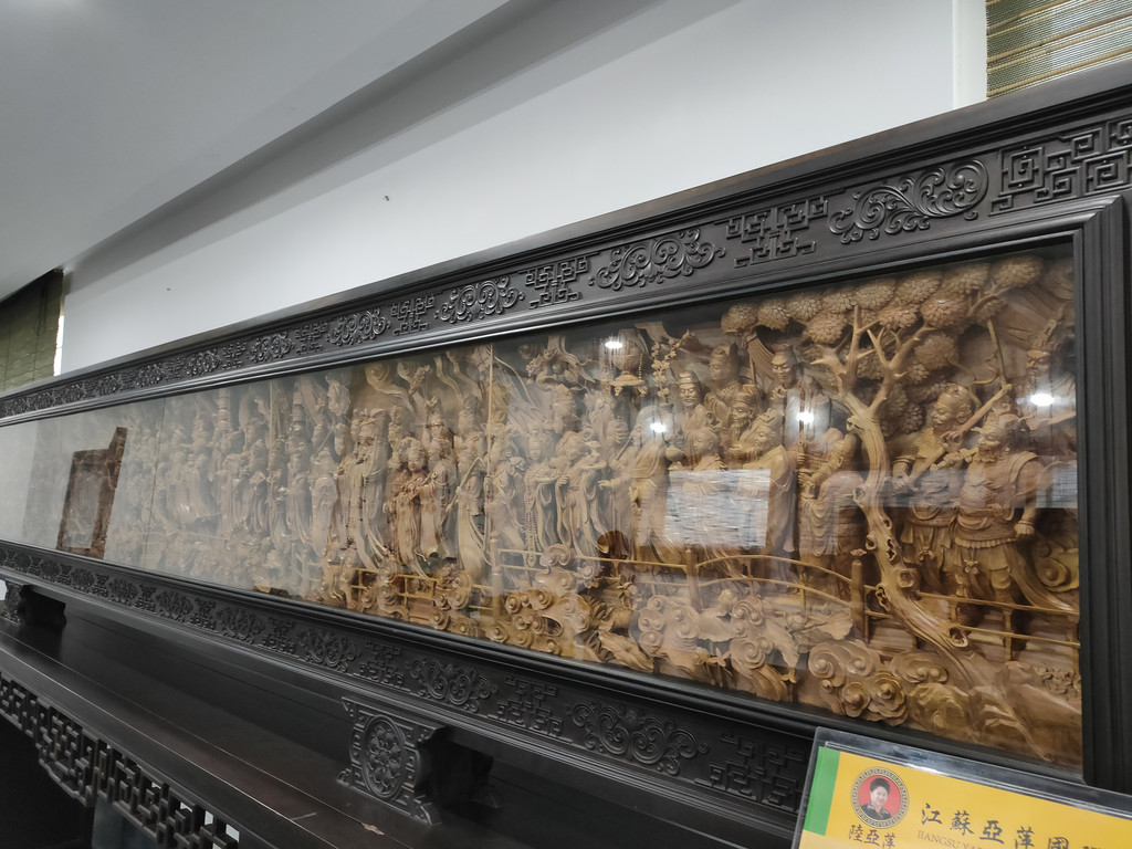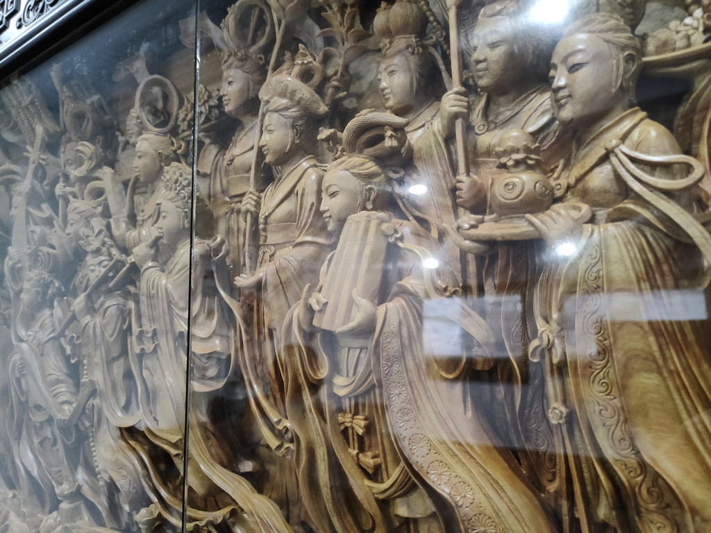 人家门口还有一幅屏风《帝释梵天图》,以帝释梵天为首的二十诸天礼佛护法的行进队伍,共绘制了二十诸天及侍从三十六个人物。这是由中国工艺美术大师历时三年时间完成的木雕作品,虽然不设色,但却感觉很绚丽。缘于人物的衣褶、头饰、裙带等都勾勒得十分细腻,整个场面也相当宏大。