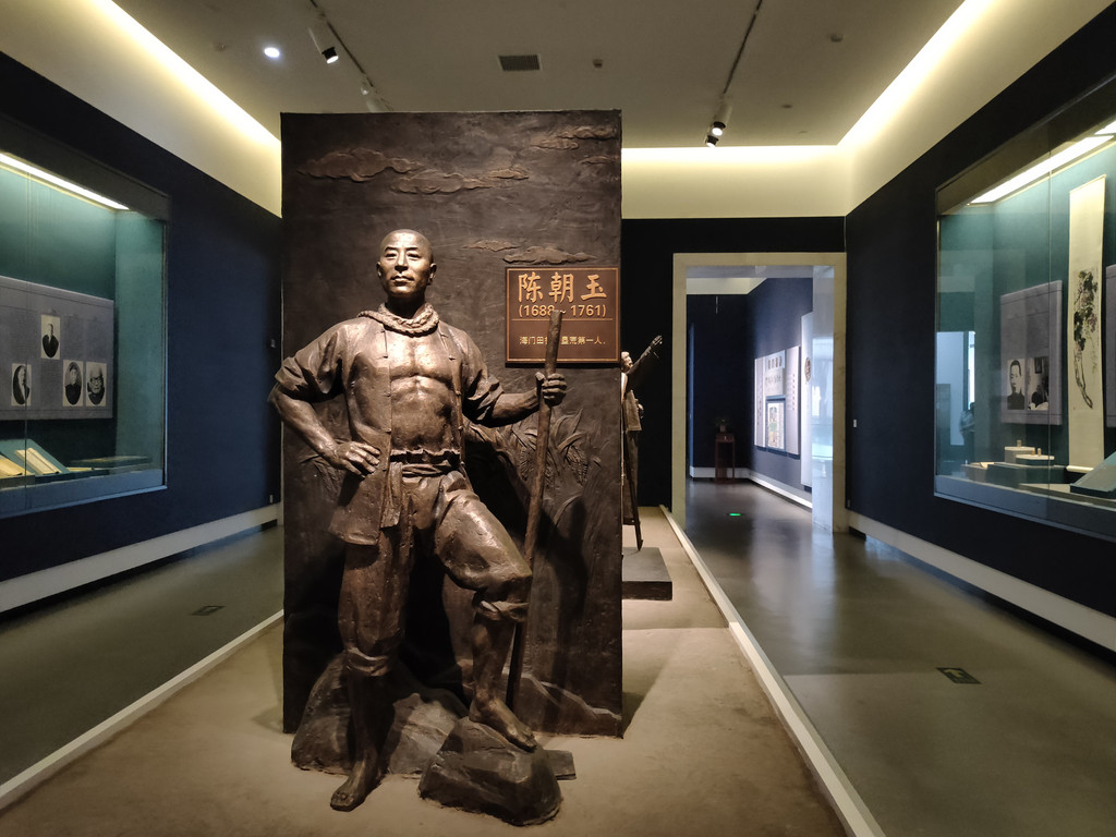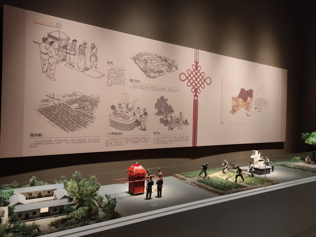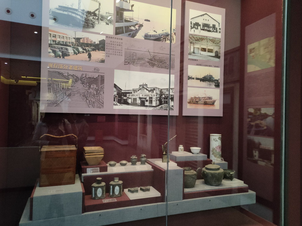 厅内有很多实物模型的还原场景,居然把古镇也搬到了博物馆里。据说海门的小镇很多,相隔一两里路就有镇,几户人家也能成一个镇,路头小店也叫镇。更奇特的是,有的地方徒有镇名,但其实并没有镇。要说海门的小镇,多以姓氏为名,像张家镇、汤家镇、茅家镇、史家镇,还有取吉祥的意思,如三和镇、三星镇、长兴镇、常乐镇、三阳镇、悦来镇等。大的集镇有纵横交错的两条街道,而大部分的小镇只有东西向一条街道。还原的小镇街道当然不可能整个临河而建的格局,但街上的小店倒是尽可能地还原了,什么铺子都有,甚至还做了个楼梯,很仿真。