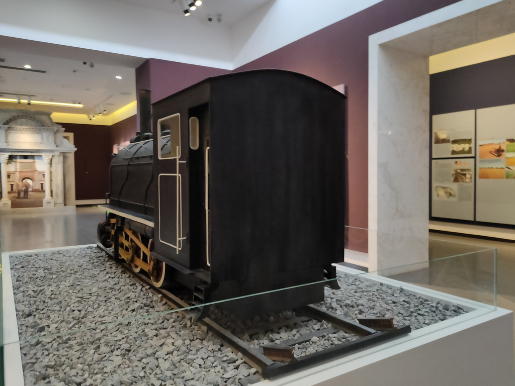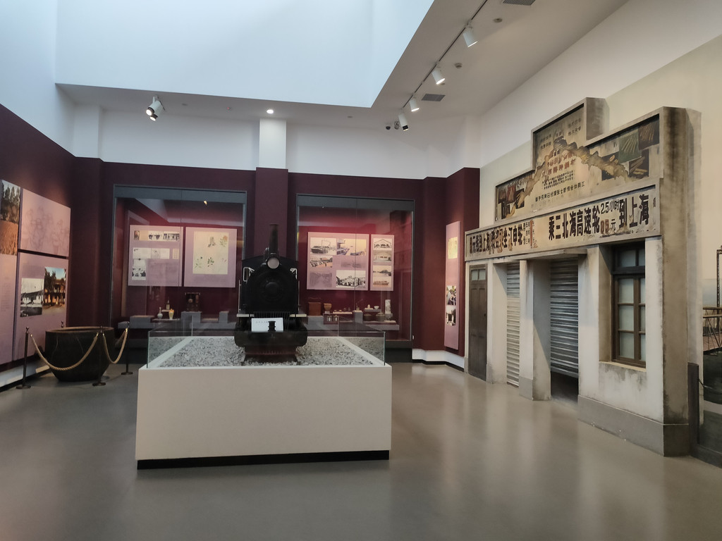 展厅内居然还有一节小火车,旁边介绍了南通的交通发展状况。大生三厂为 解决运输问题,铺设青龙港至大生三厂的铁路,全长六点五公里,占地八十亩,据说是全国最有特色的铁路之一。不过现在这条小铁路早就被拆除了,我们也只能从图片上看到曾经的样貌。