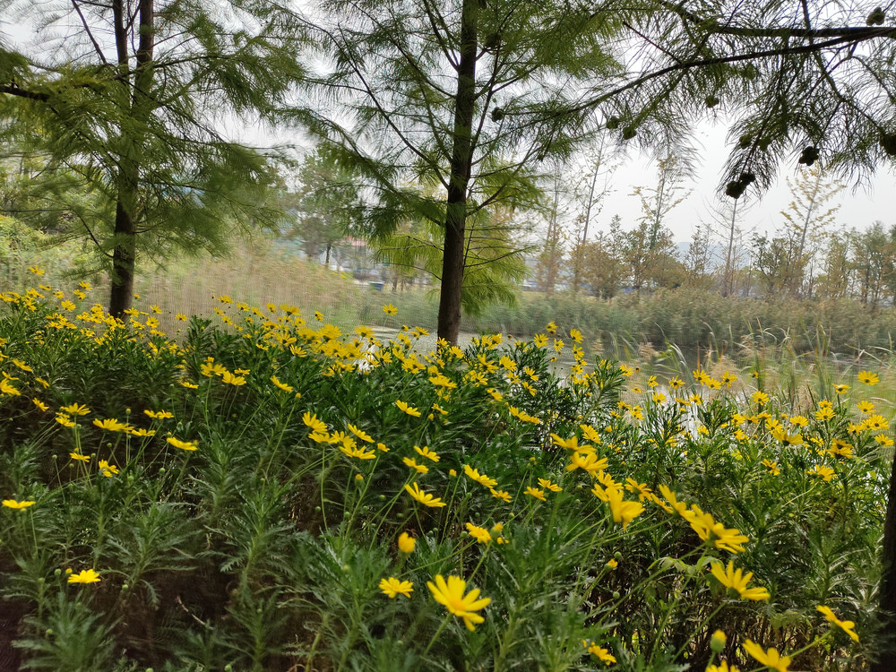 黄金菊真的如它的名字那样,花朵的颜色是金黄色的,非常明亮。当它们被栽种在水边的时候,颜色就更加耀眼了。江海文化公园本身不算太大,湿地生态岛的面积就更小了。但这么一个小岛上,黄金菊的栽种范围却相当之广。树林很茂盛,尤其是杉木高大挺拔,黄金菊就栽种在大树的周围,小岛的边缘部分。