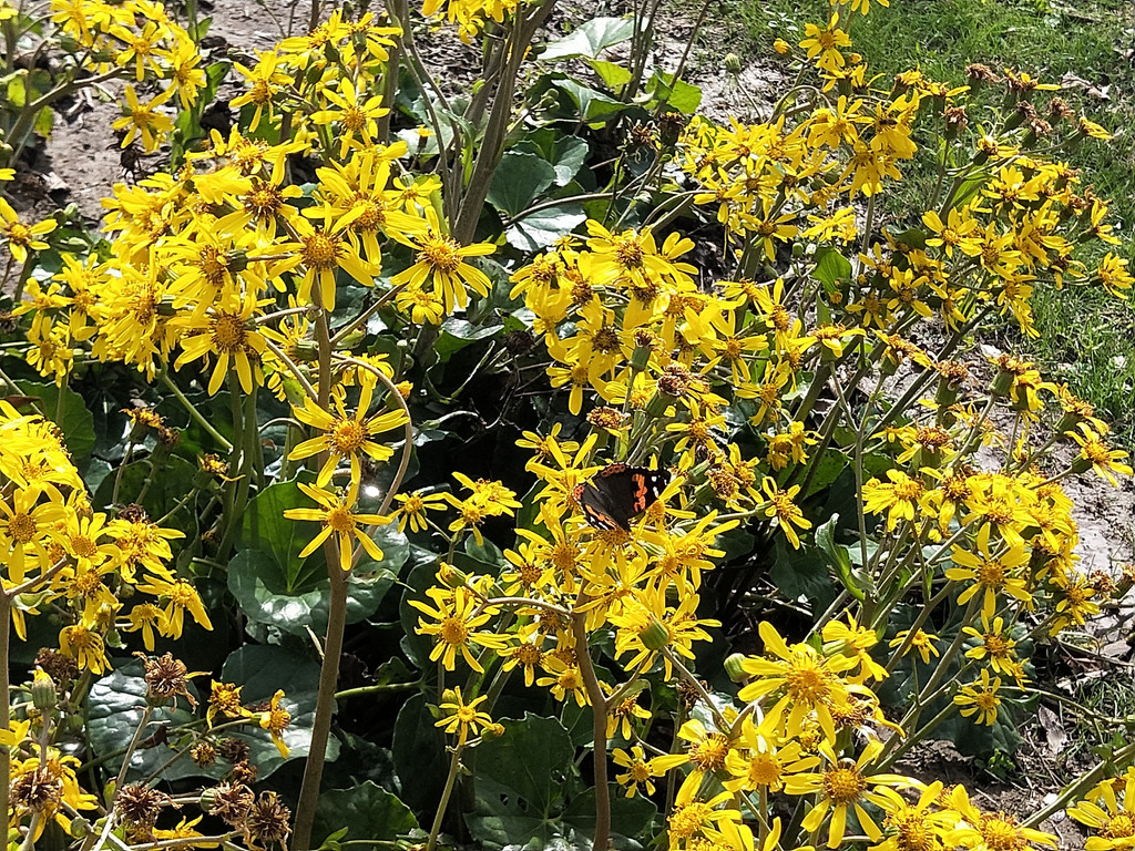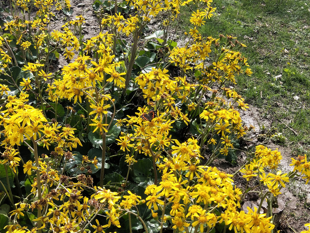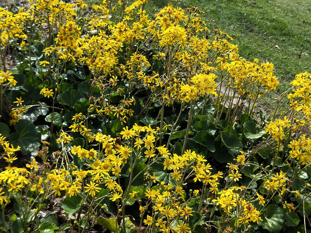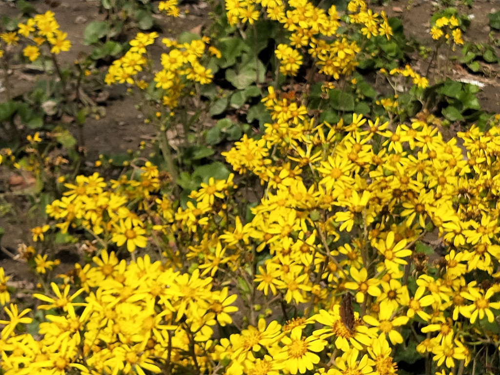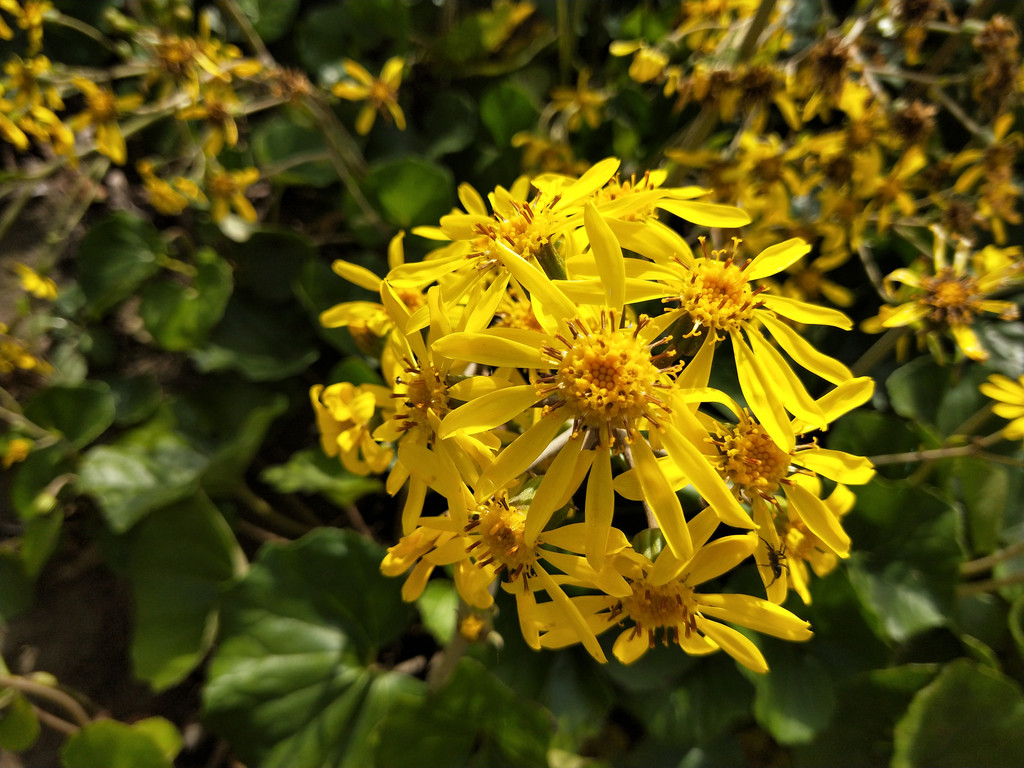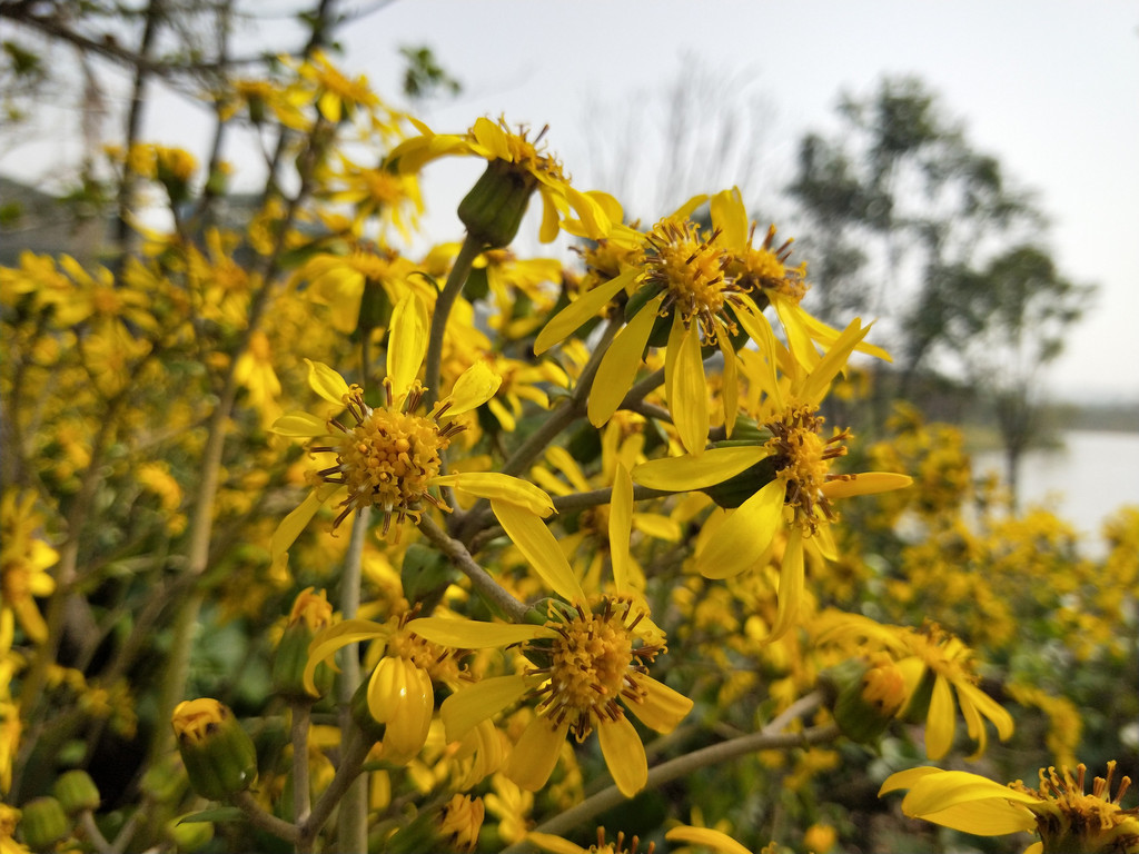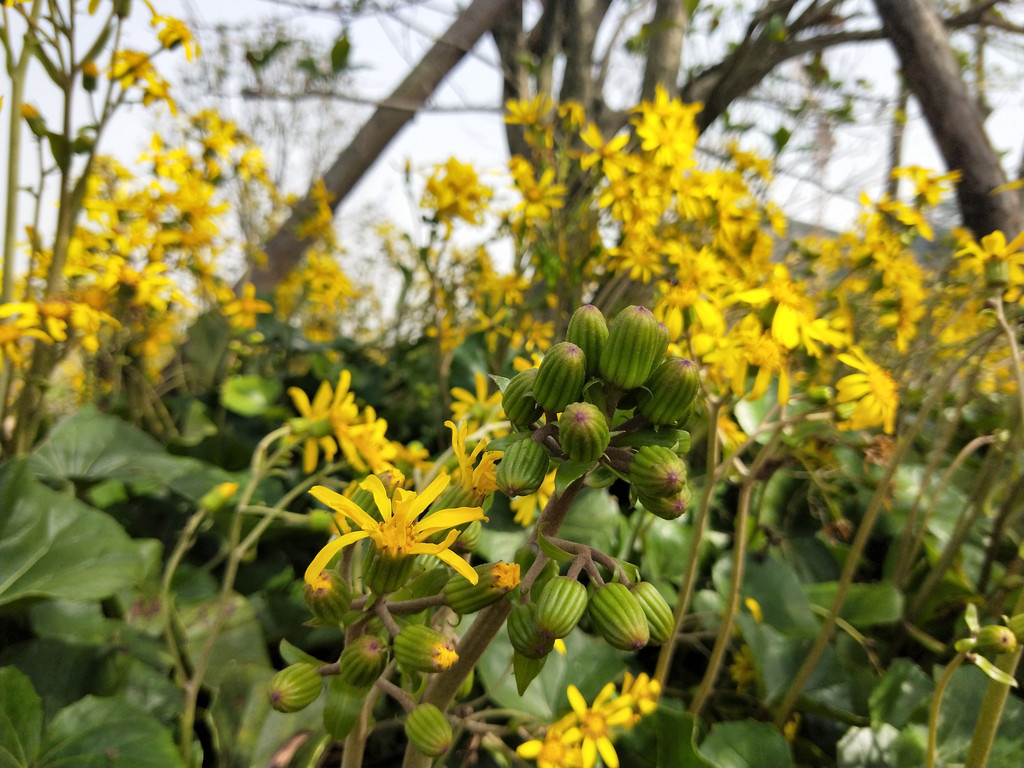 这片大吴风草开得实在是太灿烂了,那一朵一朵黄色的花不算太大,但它们簇生在一起,整个河滩都被黄色给覆盖了。虽然它们的叶子也挺有特色,在扒拉开花朵观察过它们的叶子以后,我终于解开了曾经的疑惑。它们的叶片接近圆形,看起来与睡莲的叶子真有几分相似,所以有的地方才会把它称作活血莲、一叶莲、独角莲。