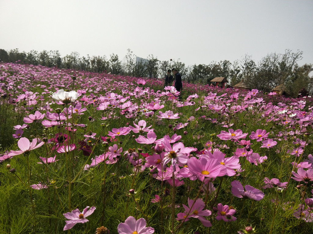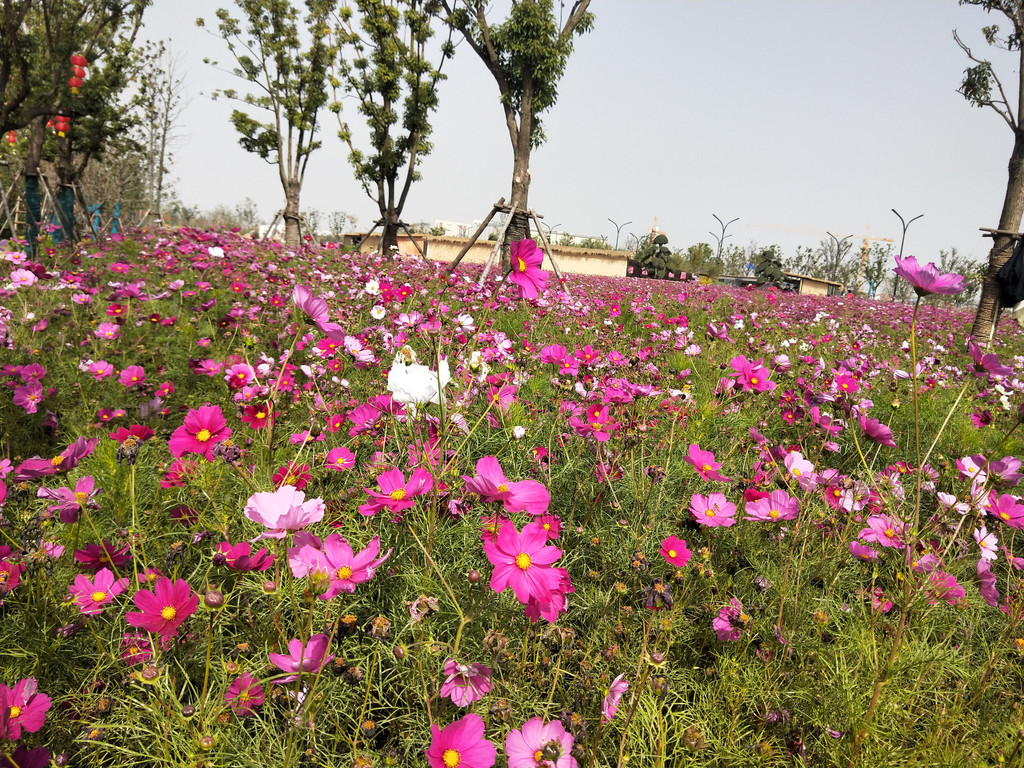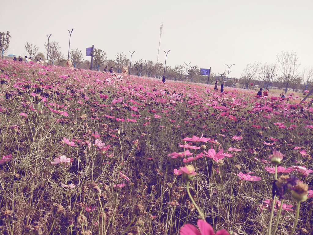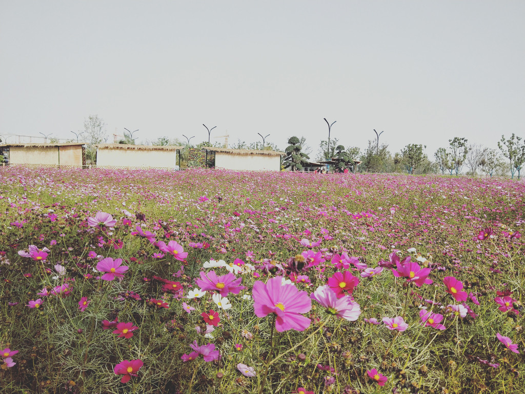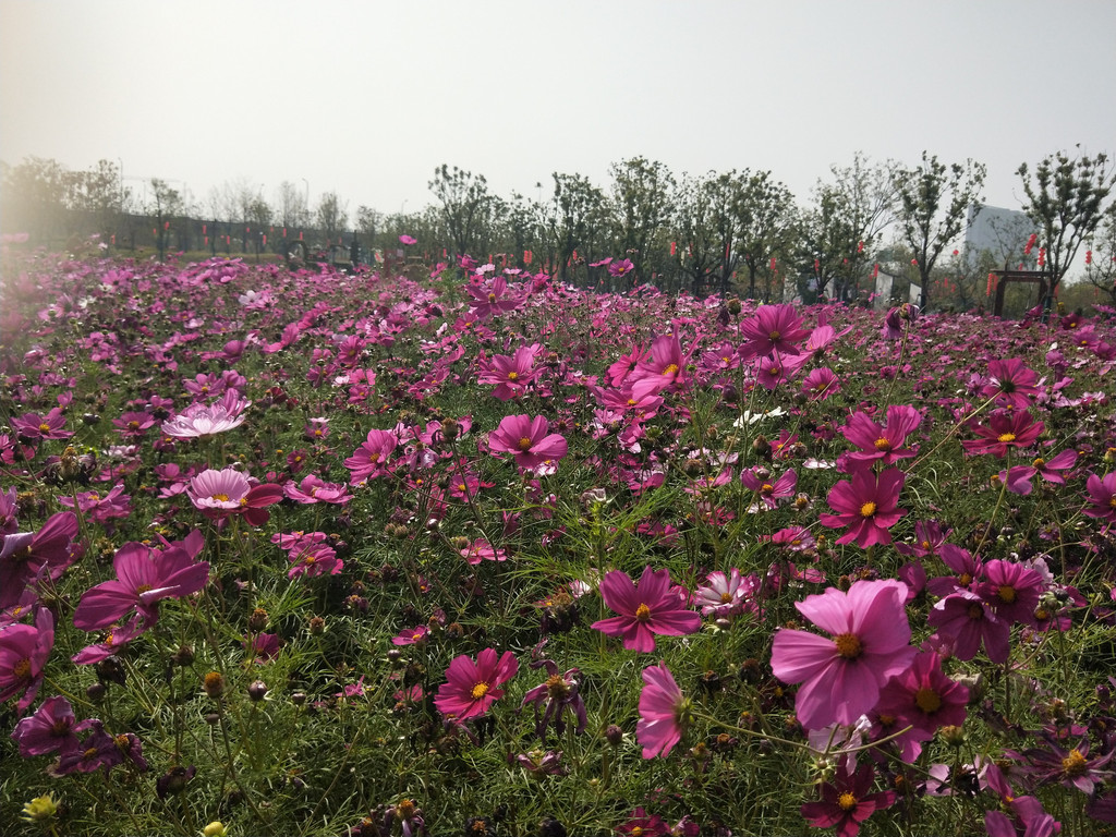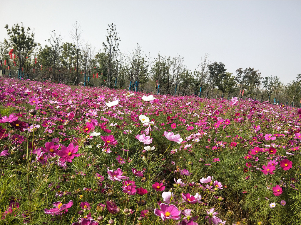 自从第一次见到波斯菊以后,几乎每年都会与它来个亲密的接触。除了头两年,其实后来倒也不是特意非要去看望波斯菊,主要是因为它们的栽植范围太广了,不经意间就会遇到一片花海,规模还都不小。紫琅花海也有大片的波斯菊,栽植在百日草的一路之隔。