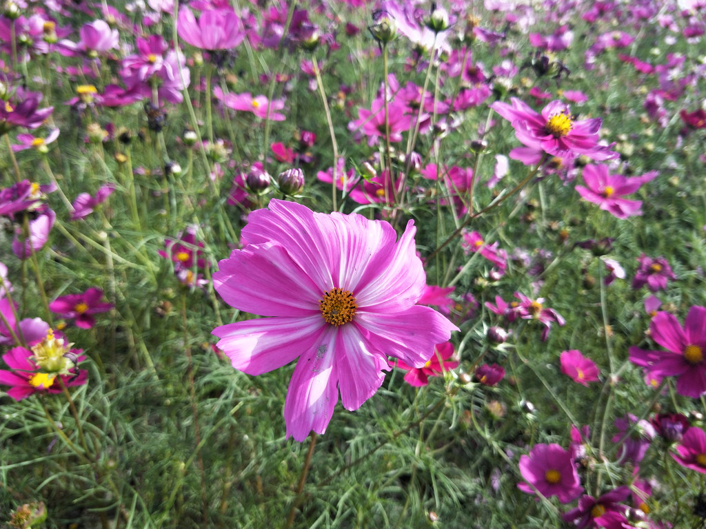 与百日草花海千篇一律的大红色不同,波斯菊的颜色就丰富多了。因为波斯菊真的不容易按颜色划片种植,可能它们的种子就是各种颜色混杂的。从白到紫红的颜色跨度,几乎把每个色度都可以占全了。相对于那片红色海洋来说,波斯菊的颜色算得上是相当素净的了。白的、粉的、玫红的……很难得会出现几朵深红,大片的轻粉色在阳光很妩媚。波斯菊的姿态也是很妩媚的,细长的茎枝在风中款摆摇曳,仿佛跳着一场欢快的华尔兹舞曲。因为茎枝太细,花瓣太薄,只要有那么一点微风拂过,它们就会舞动起来。