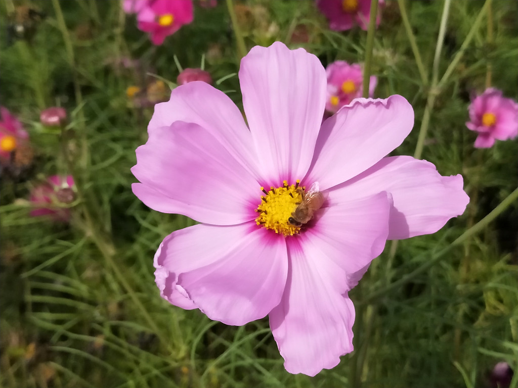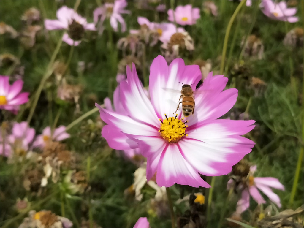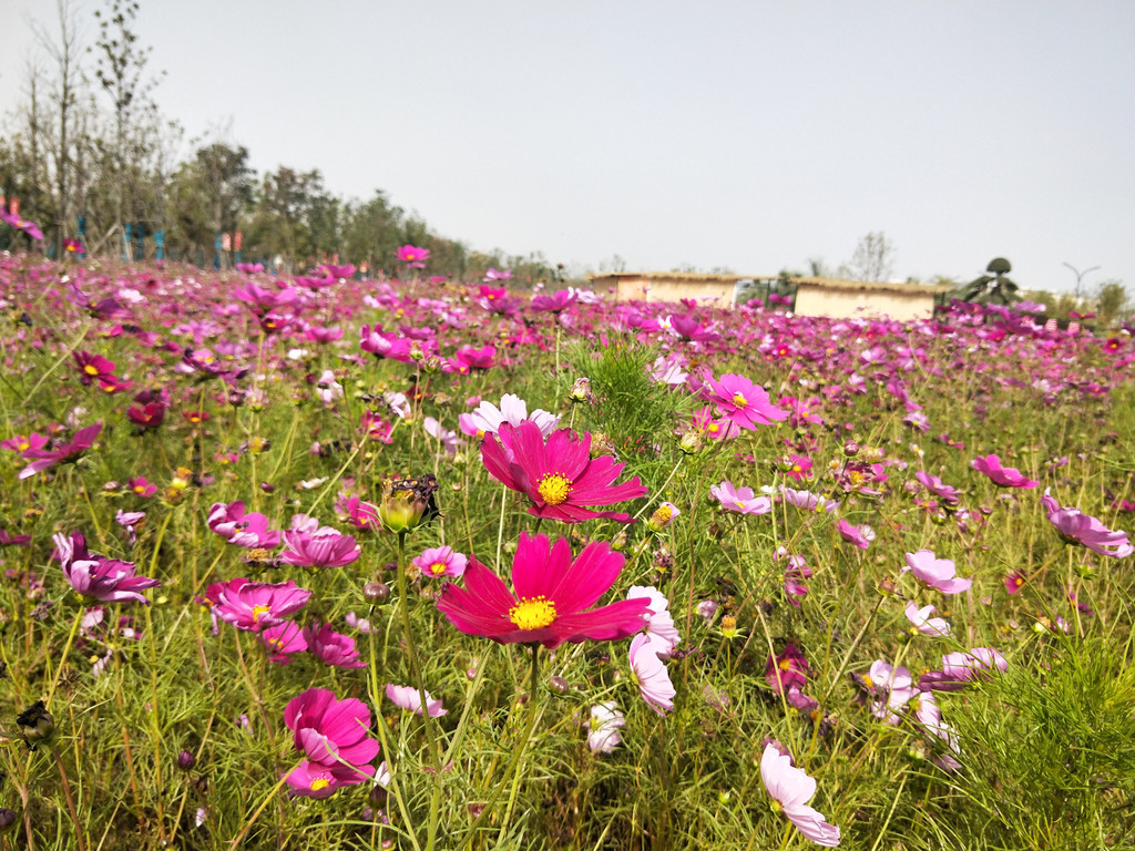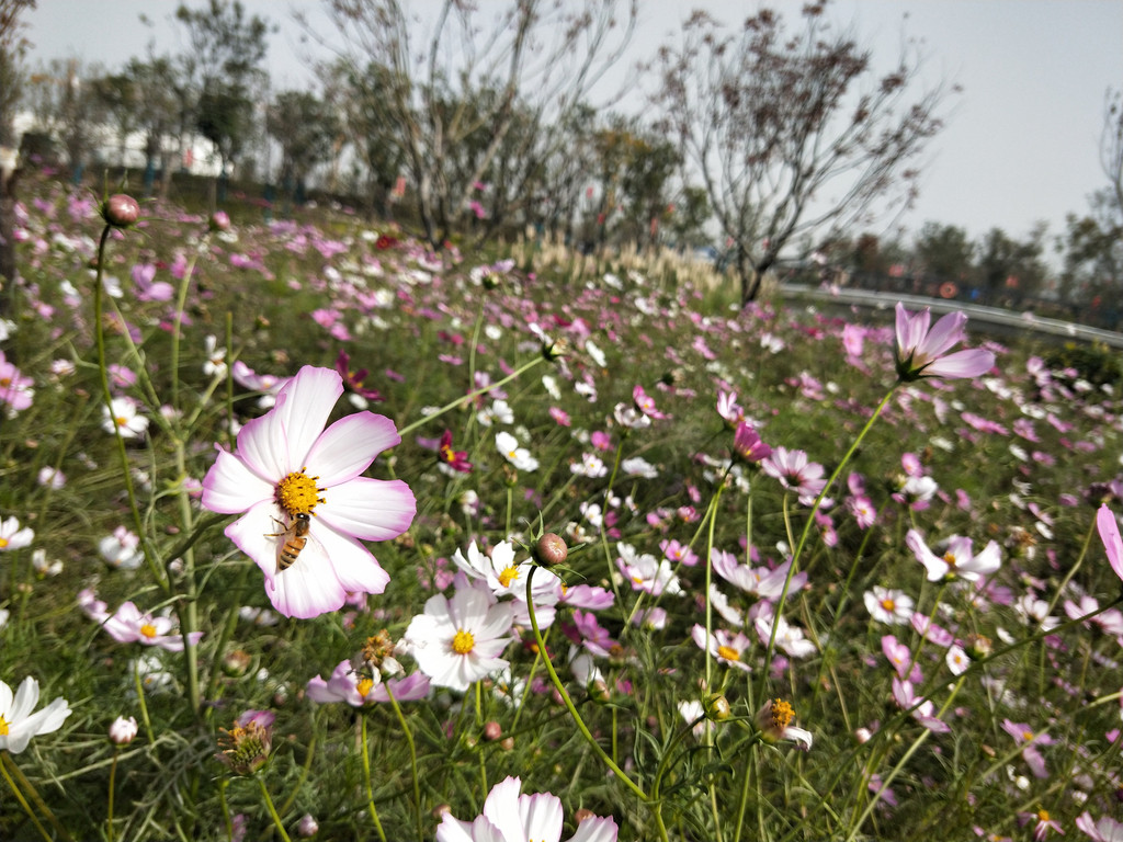 连蜜蜂都似乎格外青睐波斯菊,紫琅花海除了菊花、百日草,还有一串红、万寿菊等花卉,只是栽种面积没有这么大。但是以波斯菊的花朵上停留的密蜂最多,其他花朵几乎没有看到蜜蜂的踪影。我轻嗅了一下,波斯菊的花香并没有那么浓郁,难道蜜蜂也是一种看颜的昆虫?