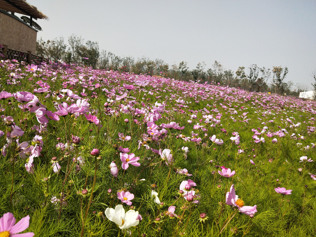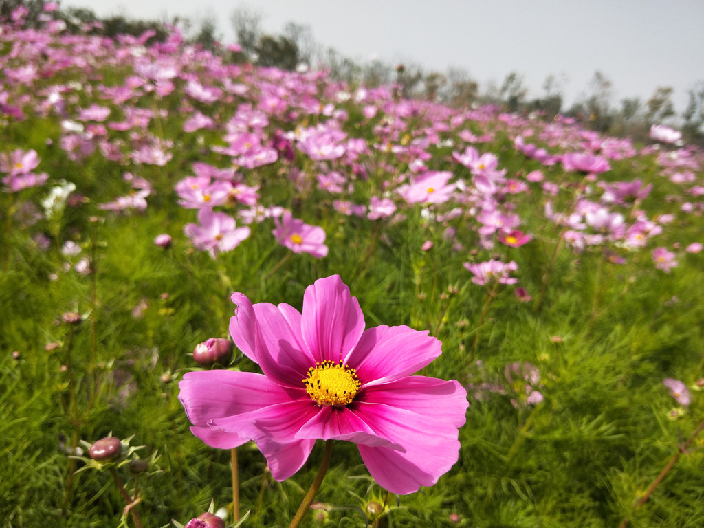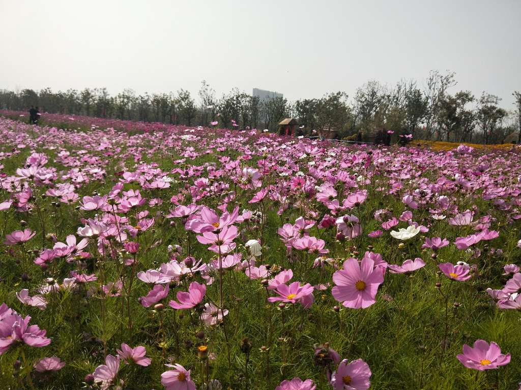 花盆里栽种的波斯菊虽然看着满满一盆,但就观赏性来讲,还不如月季和大花美人蕉。波斯菊长得挺高,只是植株看着实在纤弱。叶子也不是大片的绿色,看着细细碎碎的。可以说,波斯菊从茎到叶再到花,都显得很柔弱的样子。风吹过去,就东倒西歪。雨落下来,也仿佛不堪承受其重似的,有时候会被骤雨打得伏倒在地。但是天气一旦放晴,它们又能直起腰杆了。当它们一旦栽成了花海,这颜值一下子就提高了至少三五个档次,从平凡无奇的草本小花,提升为粉红浅白的花海。波斯菊的个子比百日草要高,虽然颜色没有那么热烈,但清一色都是很温暖的色调,又是浅色居多,总让人想起素雅的江南女子。