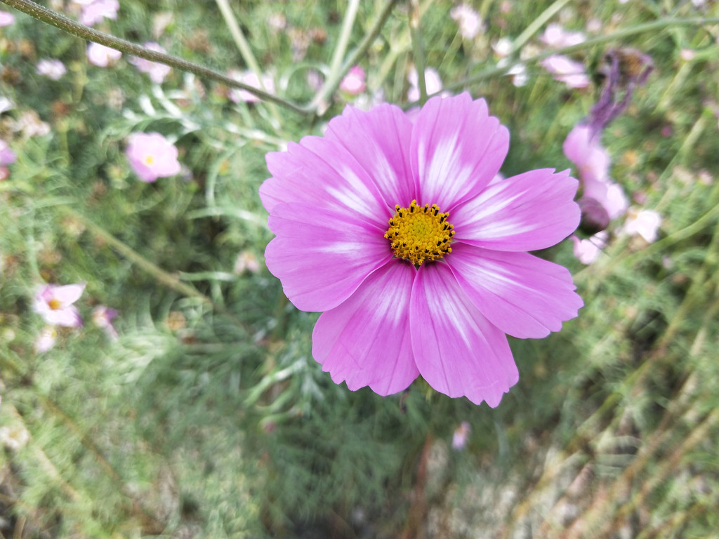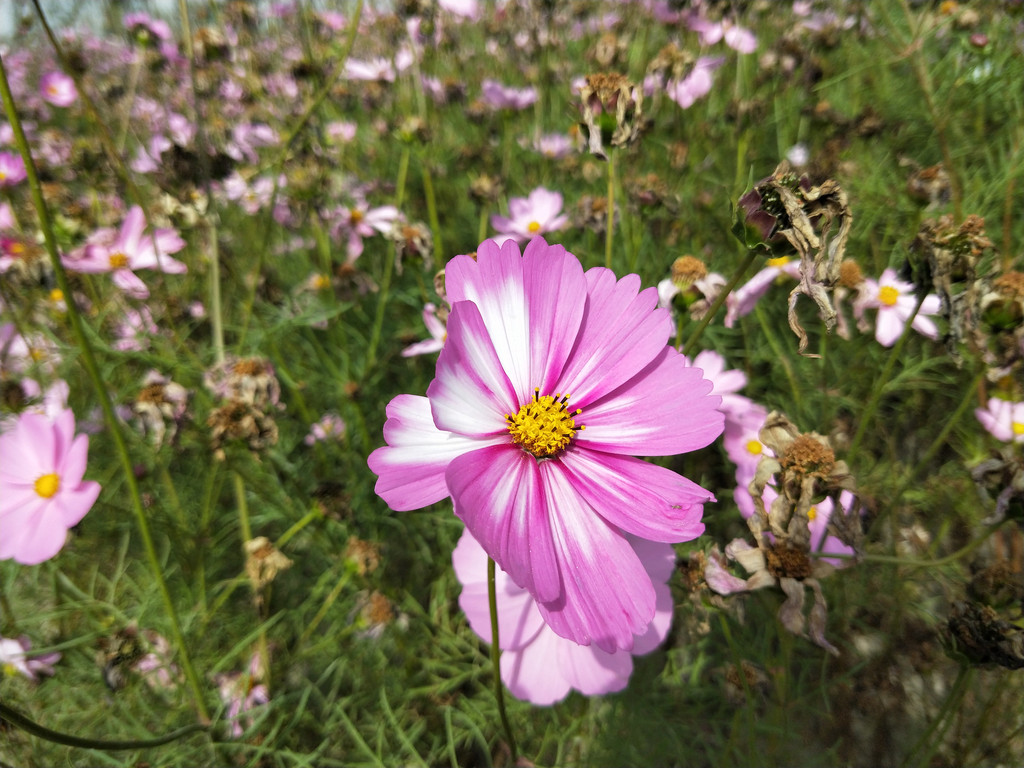 十月份还能看到波斯菊开得这么好,也是人家养护得当的缘故。当然,花种应该是夏季才播下去的,同一植株应该是不能花开两季的。它们开得实在很恣肆飞扬,要说花期也就这一阵儿,很快随着初霜降落,波斯菊也要萎谢。毕竟虽然名字里有个“菊”字,但并不能欺霜傲雪。