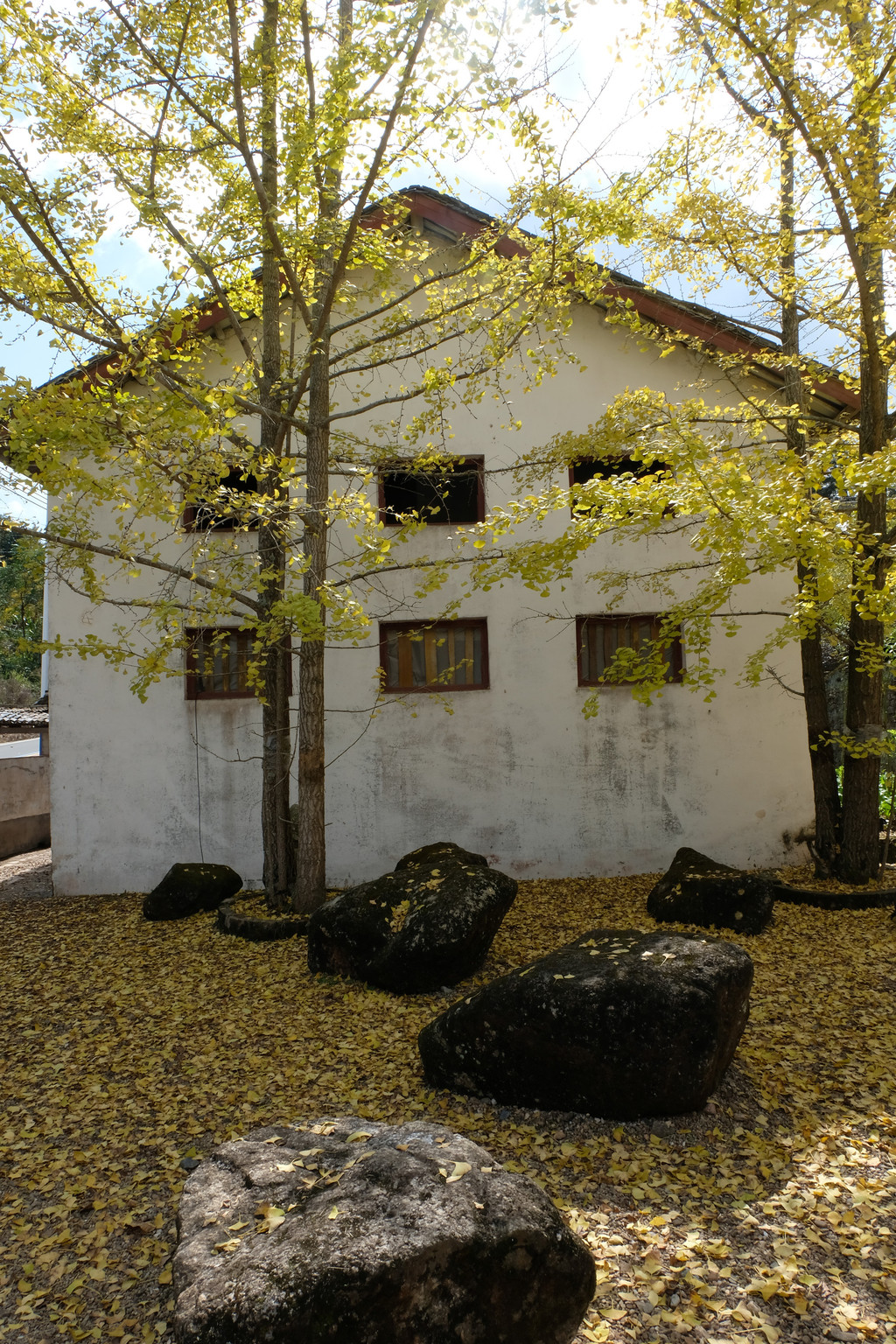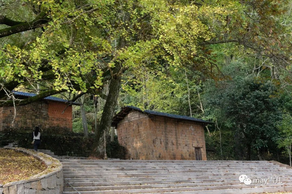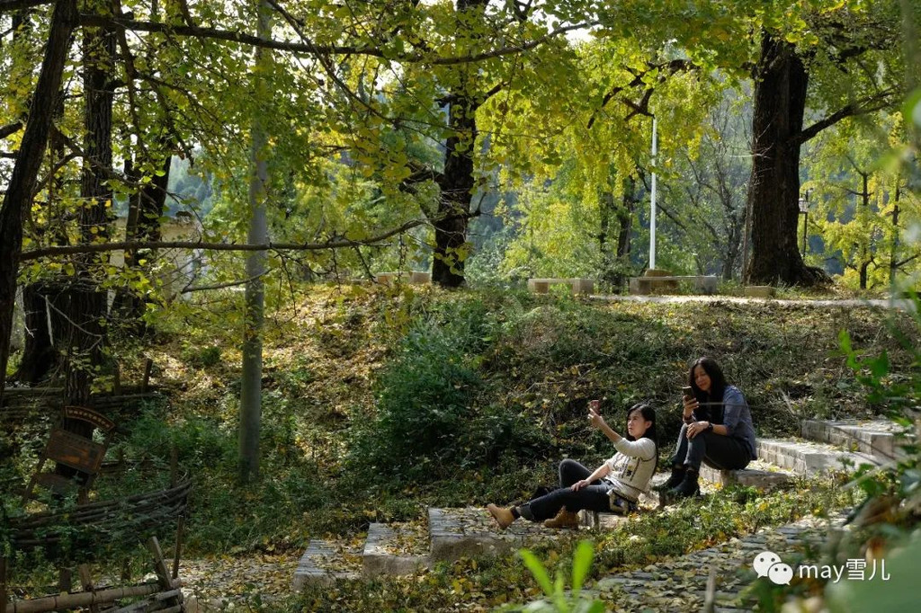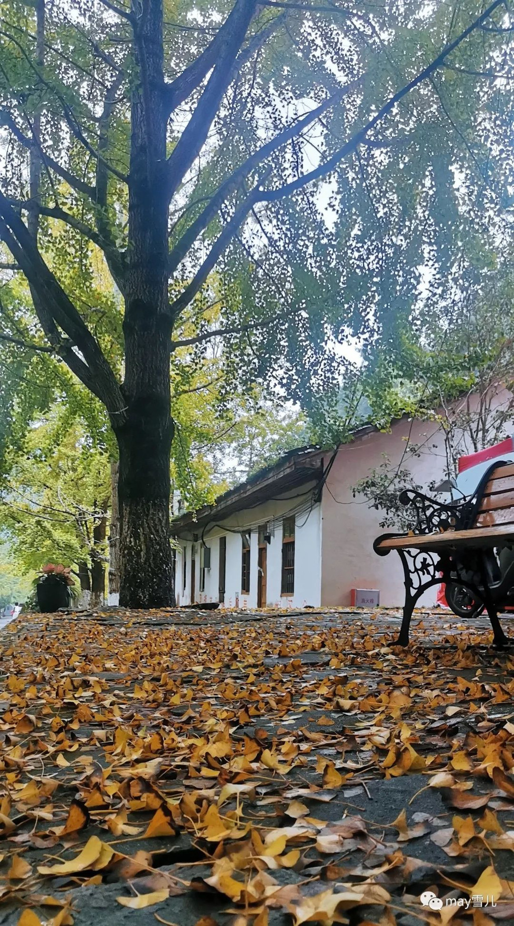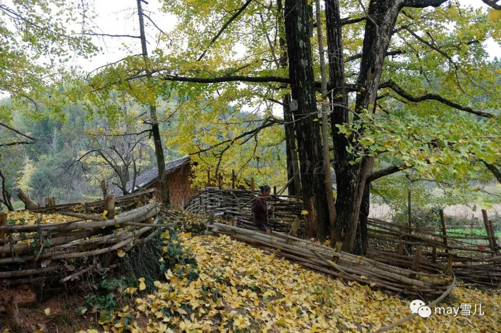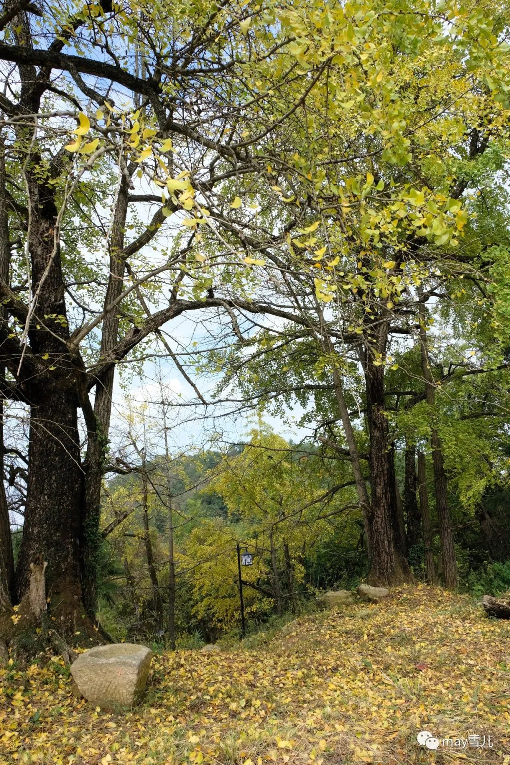 阳光之下的黄叶熠熠生辉,与帽子峰的不同,这里的银杏树古老苍劲,透着满浸的岁月沧桑,枝叶与老屋,似是在相望相守着岁月流年。
