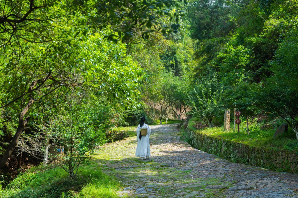 古道约6尺宽,路面整齐地铺着鹅卵石,道旁是繁茂的灌木丛,两侧山崖树木葱茏,层峦叠翠,风景秀美。这条道路横穿大庾岭,自古就遍植梅树,春天的时候漫山遍野梅开似雪,唯美至极。