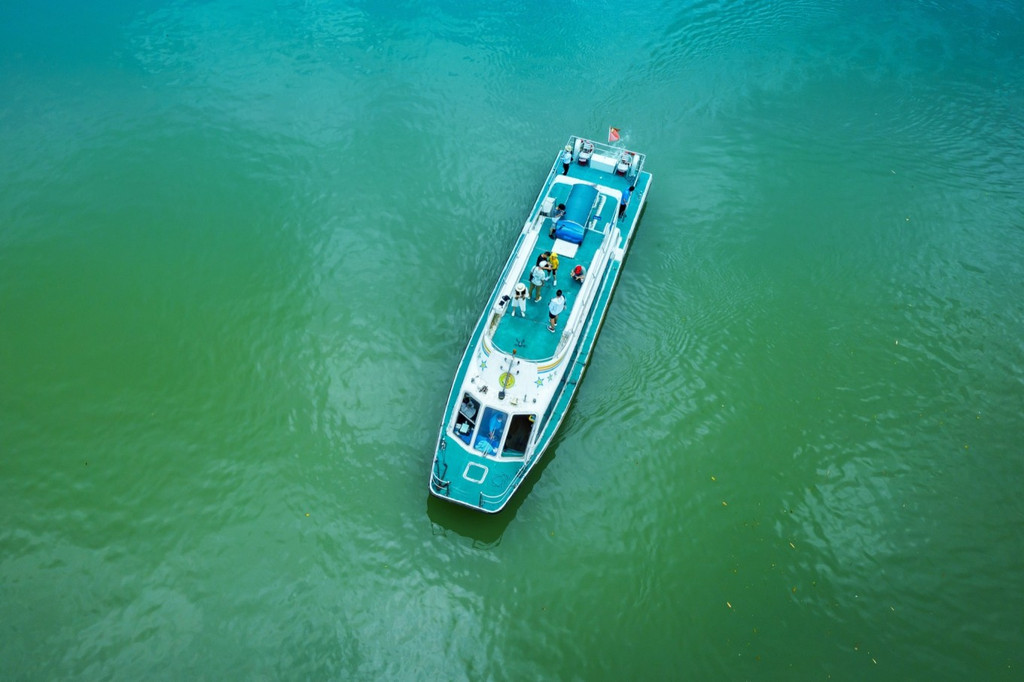 此前坐缆车上山,可俯瞰云海波涛翻滚,远眺群山缭绕飘渺。现在乘船游览,又可体会人在画中游的意境,两种体验都是相当棒的。