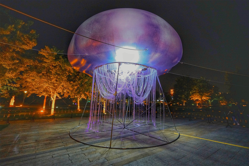 除了一只很有名的“马桶圈”喜来登酒店,最近月亮湾这里还有光影艺术展